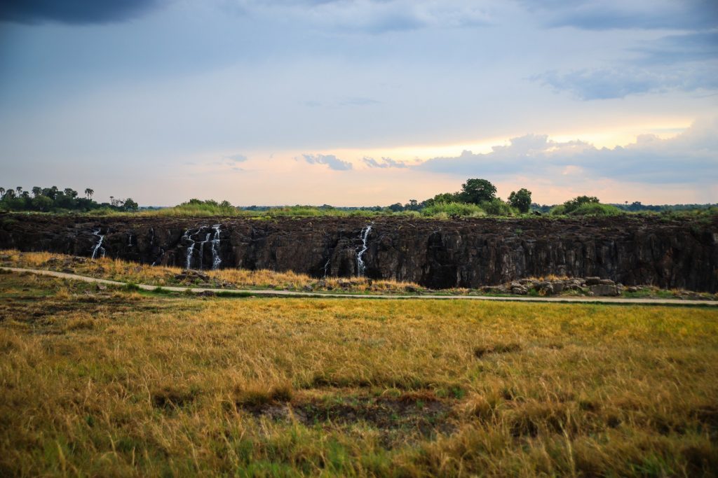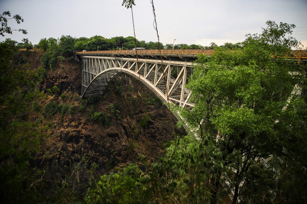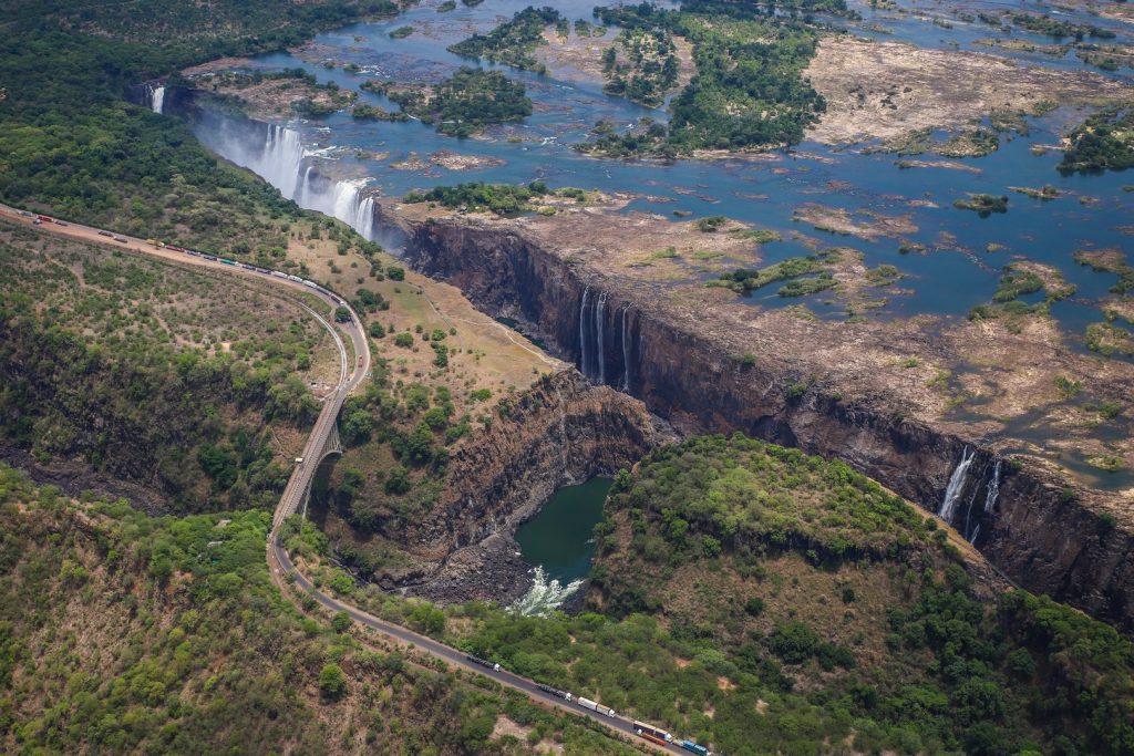 La première mission est de passer la frontière, deux heures d’attente, interminable, avec un grand bus de touristes qui passe juste devant nous. A part cela il faut une heure de route pour rejoindre la ville de Victoria Falls, hameau touristique qui ne vit évidemment que grâce aux chutes. Arrivés là, on craque, complètement. On passe dans une agence qui propose de survoler les chutes en hélicoptère. On négocie le prix de 150$ à 110$, la saison est basse (le niveau de l’eau aussi) on en profite !