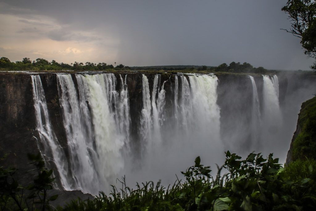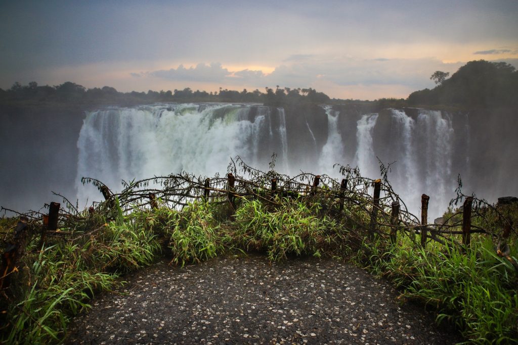 Direction le manger now, comme à priori beaucoup d’agence, on nous emmène dans un resto « très fortement recommandé ». On aime pas trop le principe mais bon, quand on voit le restau on comprend. Le Lookout Café porte bien son nom, au bord de la falaise, on ne voit pas les chutes hélas, mais la vue est sublime, et l’on est juste à côté du beau pont entre les deux pays construit avec les restes de la Tour Eiffel. Les chutes ne sont pas loin, pour le moment on ne les a vu que du ciel ! Le repas est exquis, la présentation dingue, les prix honnêtes pour l’endroit, bon marché pour la qualité ! Il fait très chaud mais le temps se gâte au loin. Alors une fois la viande de croco engloutie on fonce aux chutes, juste au moment où il commence à pleuvoir.