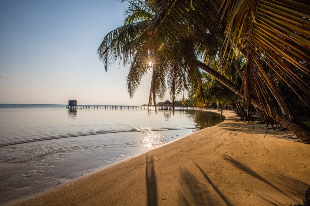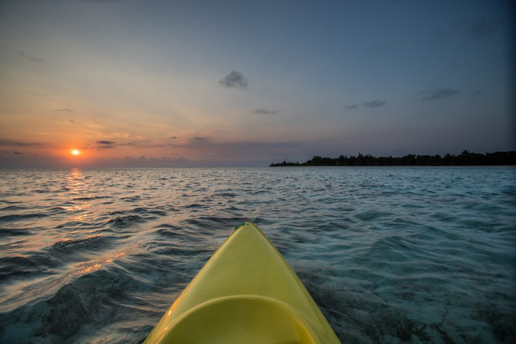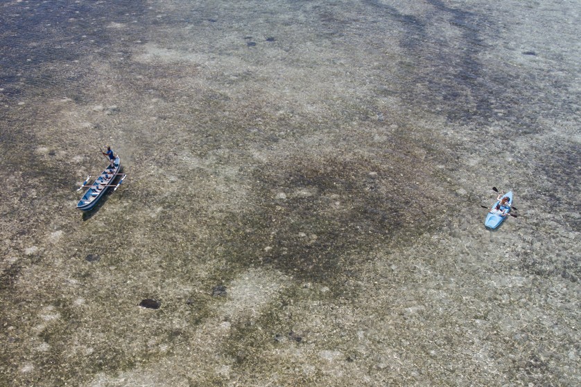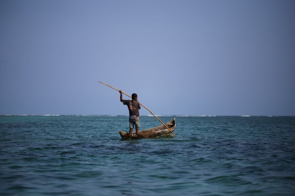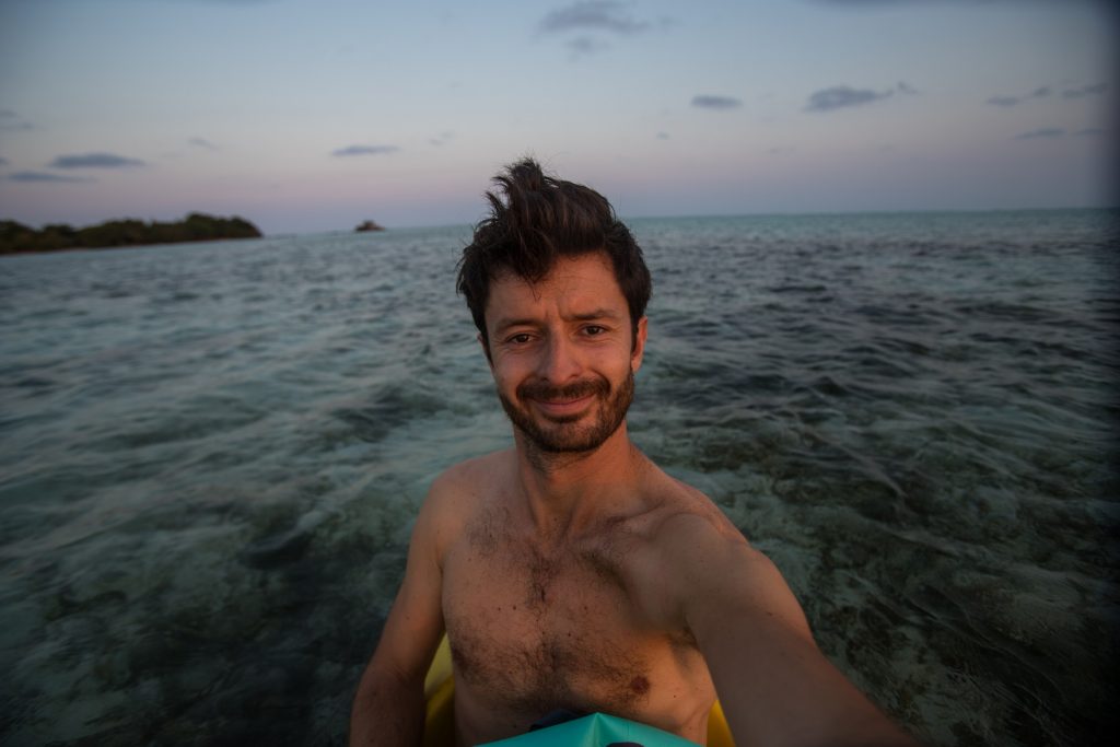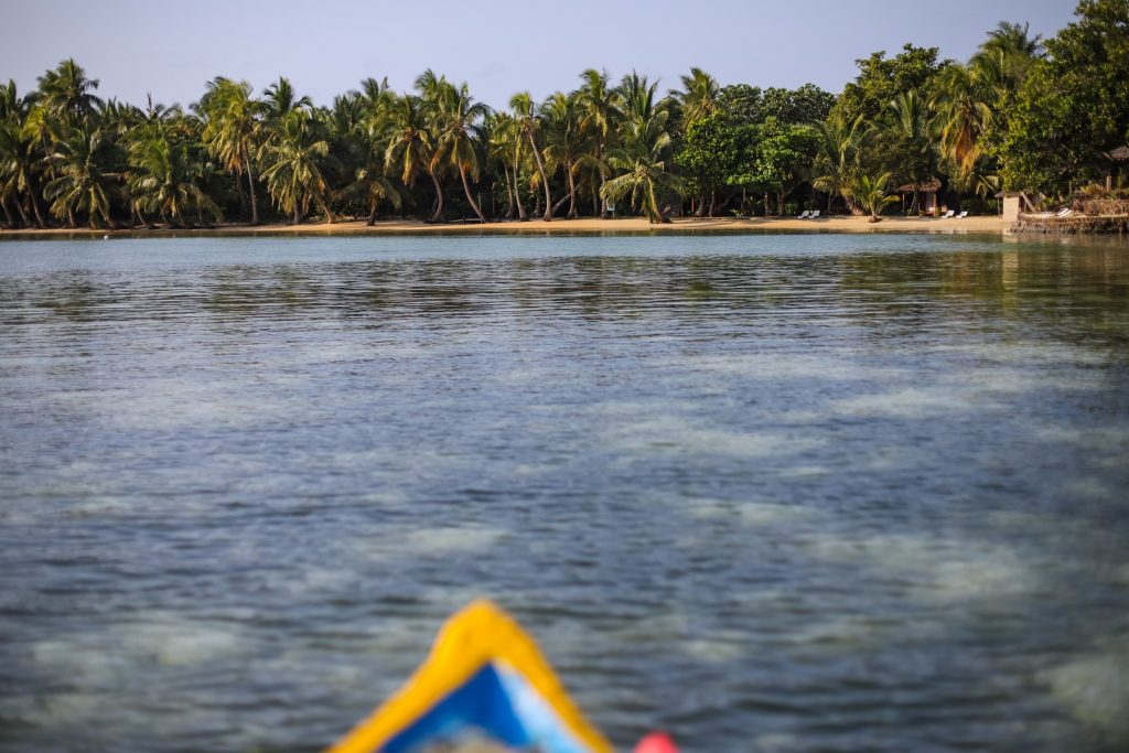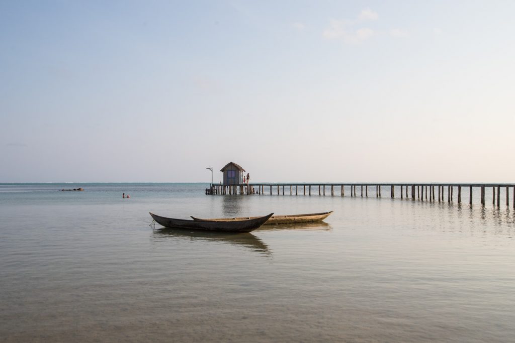 Le lendemain, petit déjeuner alors que la marée est au plus bas et que le paysage reprend vie. On part aussitôt après faire un petit tour en canoë pendant une bonne heure. Le lagon est immense, la barrière de corail est à environ 2km de la plage, en gros on a pied au milieu de l’océan, idéal pour aller tester le masque et tuba. Hélas pas beaucoup de vie ici, pas mal de petits poissons mais en gros on ne trouve plus que ce qui n’intéresse pas les nombreux pêcheurs du lagon ! Récupération des sacs et notre fidèle piroguier nous prend et nous dépose quelques centaines de mètres plus loin à un resto mythique. Juste deux tables de pique-nique posées sur le sable d’une plage idéale pour la baignade, deux plats au menu, gambas à l’ail ou poisson grillé. Rien d’autre à ajouter sinon que ce furent les meilleurs gambas à l’ail de nos vies communes…