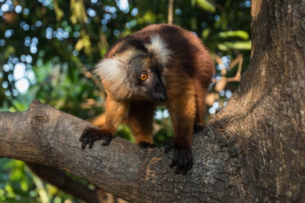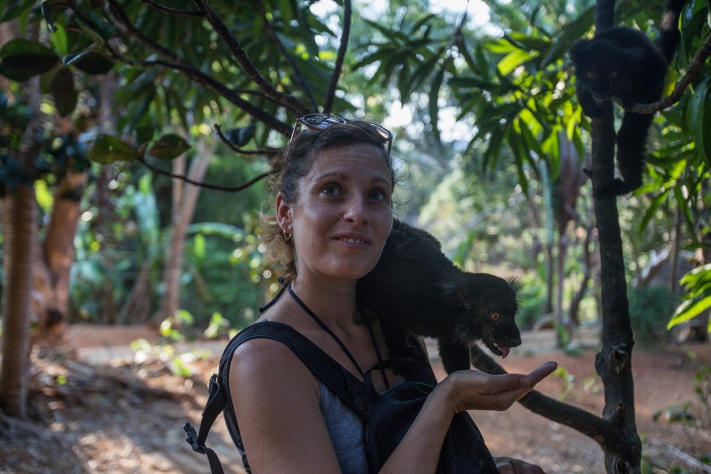 Nosy Komba, petite île de 5-6km², une montagne en fait, toute en forêt, pas de route, juste un village principal et des villas ou lodges éparpillés autours de l’île le long de la plage… On se pose à l’ïlot Village, tenu encore une fois par un couple de français. Balade pieds nus pendant deux jours. On visite le parc aux lémuriens avec Herman, qui nous présente ses potes, les lémuriens qui montent sur nos épaules, puis une tortue de 65kg et un boa constrictor qui doit bien en faire 5 ou 6…