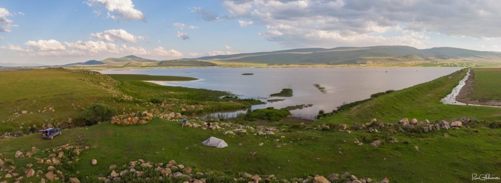 Bien fatigués de la route et de notre sommet du matin (cf article Arménie) on cherche sur la carte un endroit propice pour passer la nuit. On repère à l’écart de la route un grand lac dont les environs ont l’air sauvages. On s’engage dans une piste boueuse au milieu des champs jusqu’à tomber sur une chapelle, de là on continue à travers champ jusqu’au bord du lac. Et ici, un petit géranium, ça va être bien, très bien même ! Petite toilette dans la rivière, installation de la tente sur un surplomb, vue lac et montagne, herbe douillette, un coup de réchaud pour un succulent repas de nouilles chinoises et d’œuf au plat…