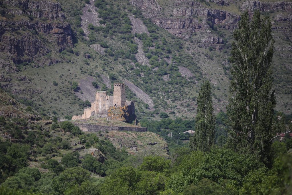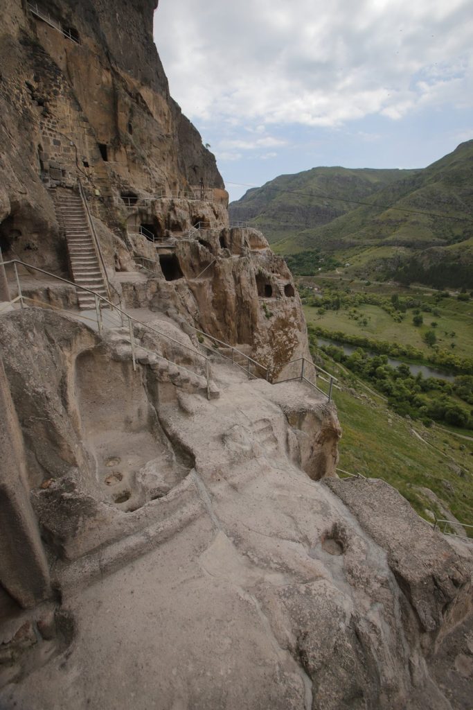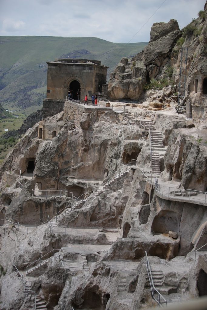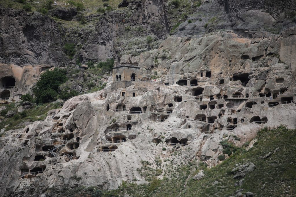 Le lendemain on continue notre route vers le nord ouest. Sur le chemin on trouve régulièrement d’impressionnantes ruines de forteresses perchées sur les hauteurs, restes d’une époque qui nous parait assez hostile. Finalement nous arrivons à Vardzia, une impressionnante cité creusée dans la falaise. Il faut bien monter pour l’atteindre puis on plonge dans les grottes primaires, les longs tunnels qui débouchent sur des balcons, des églises intérieures ou des puits de lumière. Le complexe est assez fascinant, on a du mal à s’imaginer un vie, une ville ici, tout un monde dans la falaise…