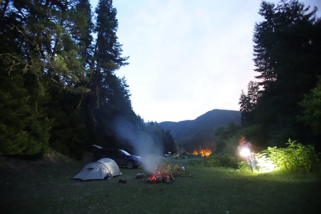 Après on bon dej au bord de la fraîche rivière on roule jusqu’à la ville de Borjomi, localité pas très très jolie en creux de vallée, l’occasion de nous ravitailler mais surtout d’aller voir le Parc National Borjomi. Permis obtenus on installe notre tente à l’entrée du parc, petit feu et dîner précaire (mais qu’est-ce qu’on à branler en faisant les courses ??). Ici on espère (ou pas ?) voir des loups et des ours, un touriste pris en stop plus tôt en a vu, le mec du parc qui travaille ici depuis 9 ans jamais…