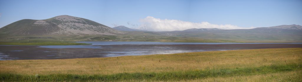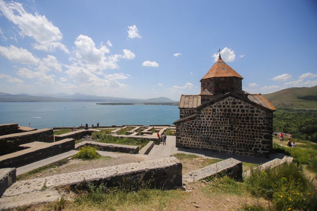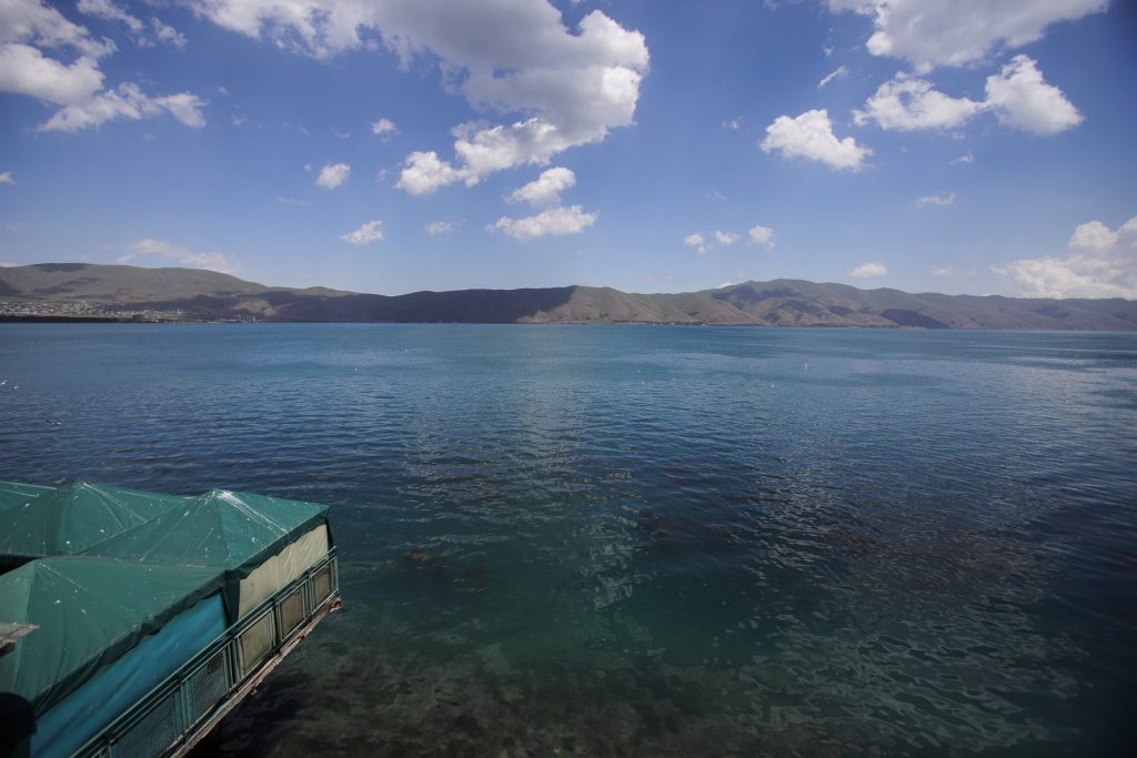 Décollage pas trop tard, on sort finalement de la vallée pour rejoindre le lac Sevan, immense et beau, sauvage, on en voit presque pas le bout. On fait escale sur une grande presqu’île très touristique, l’occasion de faire un resto et de gouter la spécialité locale, la délicieuse truite ! On grimpe aussi voir la vue depuis les monastère qui domine la presqu’île comme bon nombre de touristes.