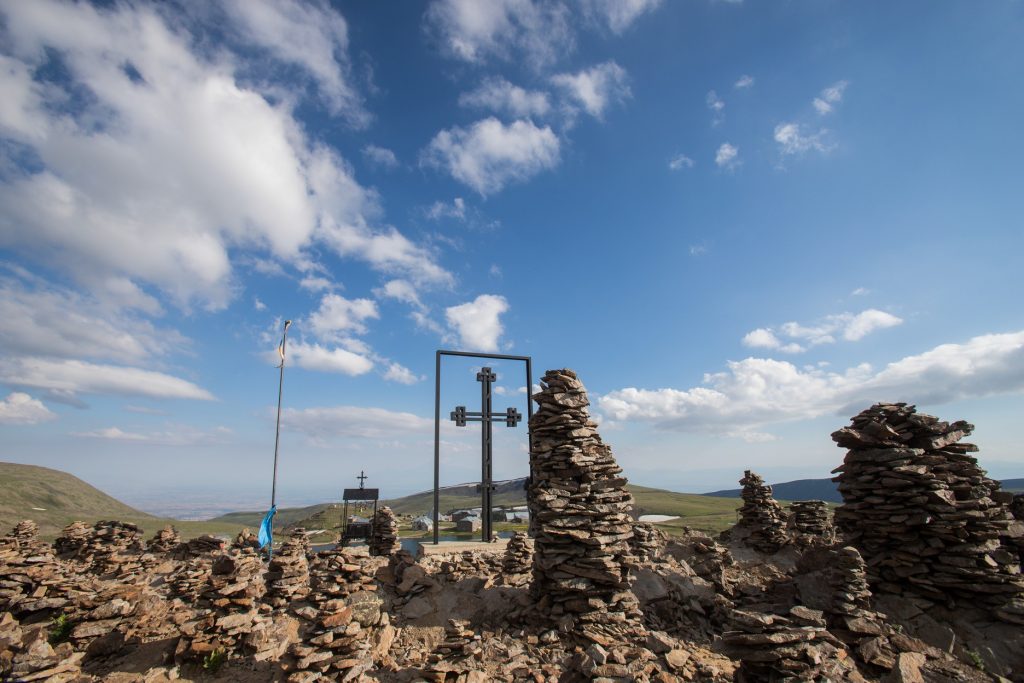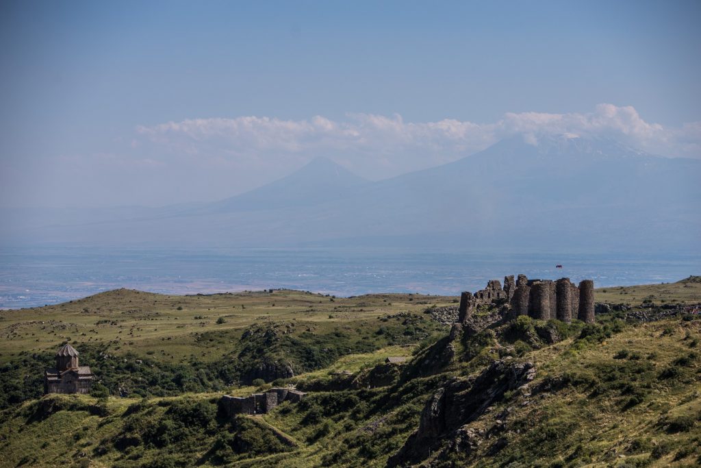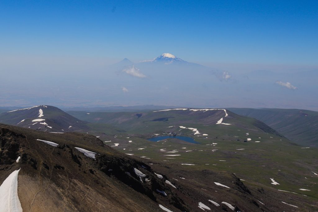 La chaleur a raison de nous et on se fait une joie de prendre la route pour notre prochaine destination, la montagne et la grosse, le Mont Aragats, 4100m juste derrière Erevan. En à peine 2h de route nous sommes déjà sur les flancs de l’ancien volcan. On visite une grande forteresse abandonnée qui avait pour but de contrôler toute la vallée (devaient courrir vite les mecs…) puis on continue à monter. On perd bien vite en température pour finalement arriver au lac à 3200m d’altitude. Ce sera notre camp pour la nuit. Il y a déjà quelques tentes, d’ici on a une vue magnifique sur le Mont Ararat cette fois, celui encore plus gros qui se trouve en Turquie avec bien plus de neige !