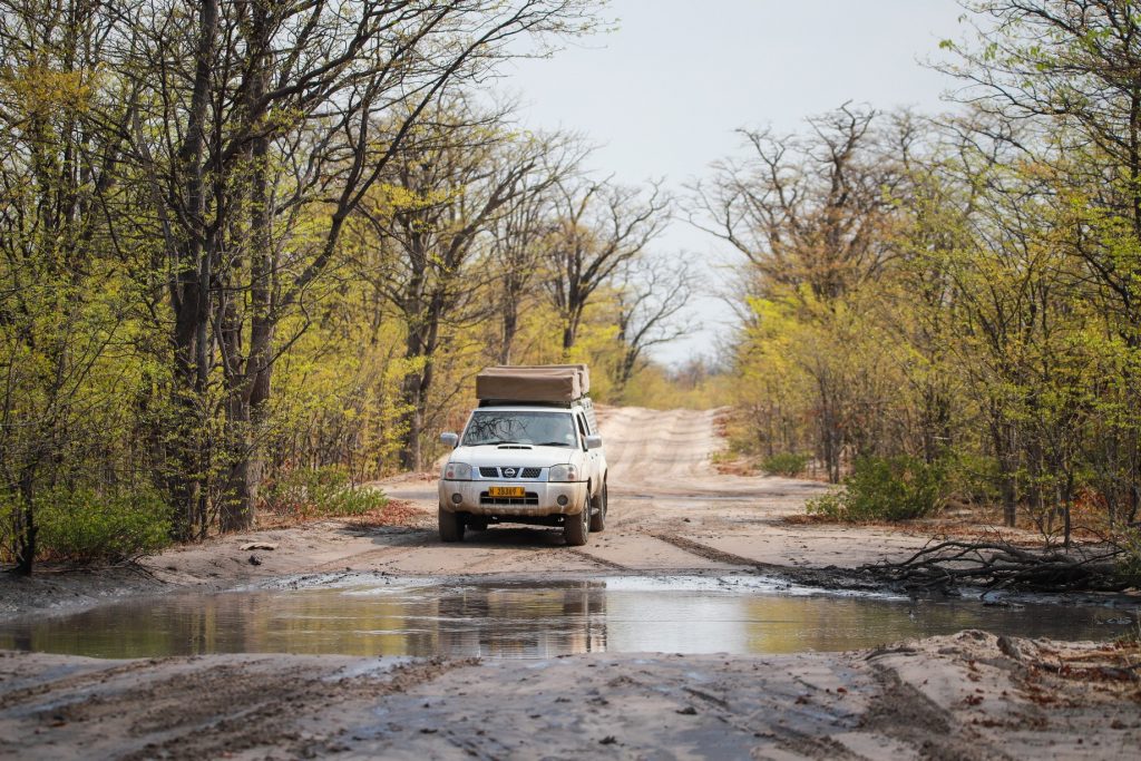 Pour la suite de notre voyage nous partons en direction de Savuti. Un mauvais choix de piste nous faire perdre 3h pendant lesquelles on doit franchir des énormes flaques très profondes et boueuses puis de longs tronçons très sablonneux. On s’embourbe une première fois puis on se coince dans le sable un peu plus loin, on casse une première sangle, nos solutions de secours diminuent aussi on décide de tout refaire à l’envers pour prendre une autre voie, au final bien plus praticable !