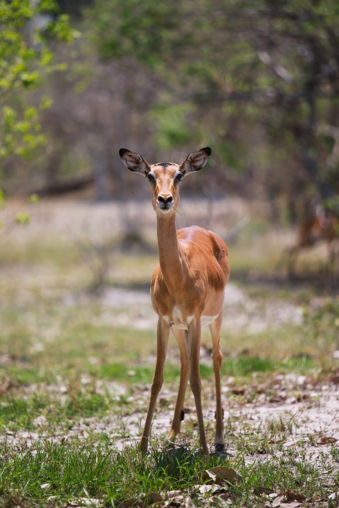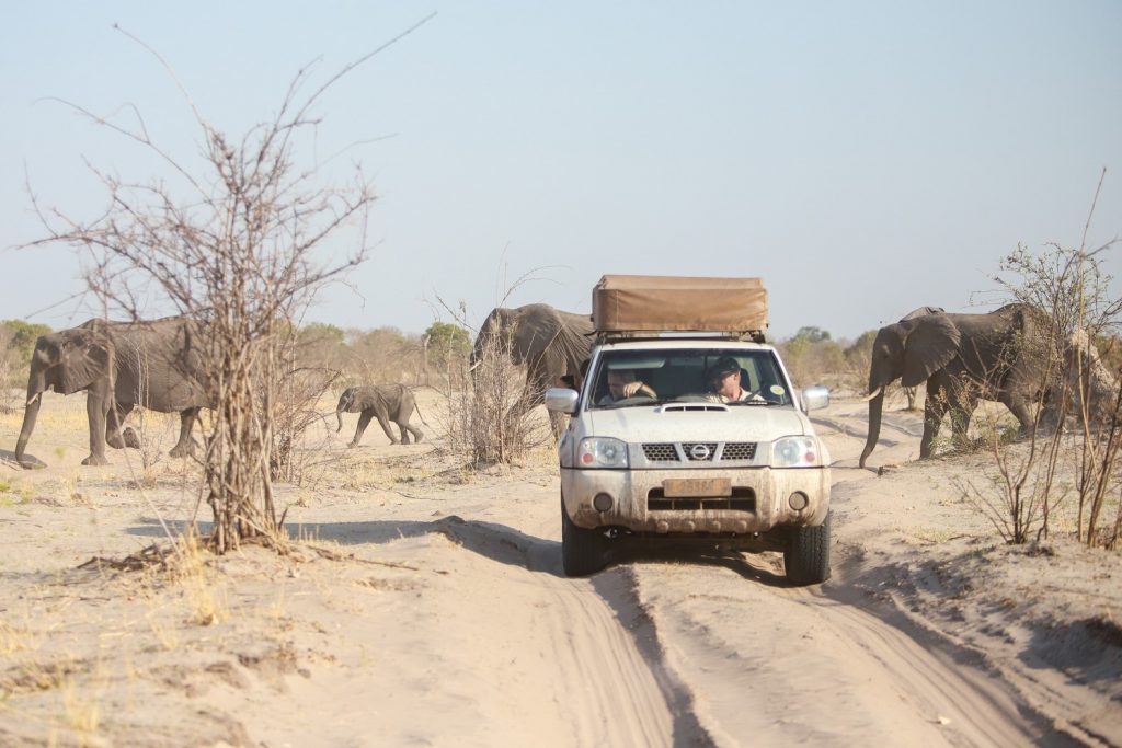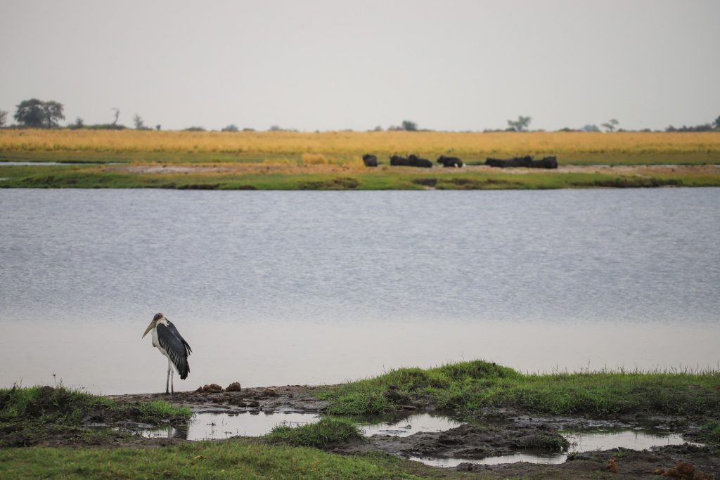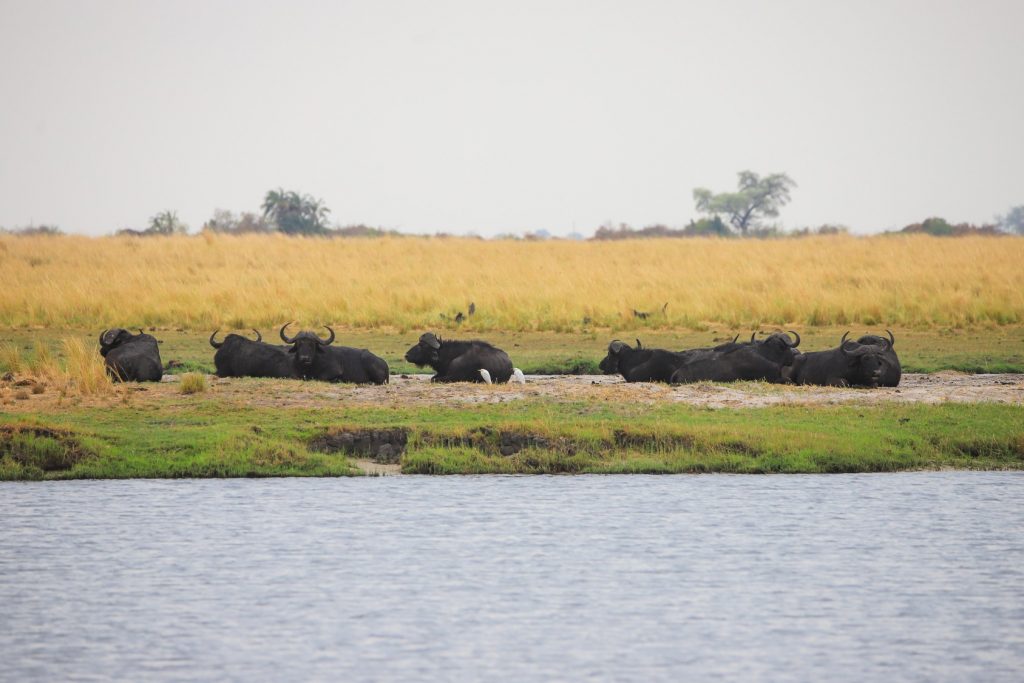 On se lance dans les 140km de piste sablonneuse au milieu de paysages passant des plaines de savanes, par les collines rocheuses et les grands arbres avant de finir par la grande rivière Chobe qui nous sépare des grands plateaux de Namibie. Désormais on retrouve le bitume pour quelques kilomètres avant de nous enfoncer dans le parc national de Chobe, en bord de rivière. Ici l’eau est de retour, le parc est assez vert et les animaux paissent au bord.