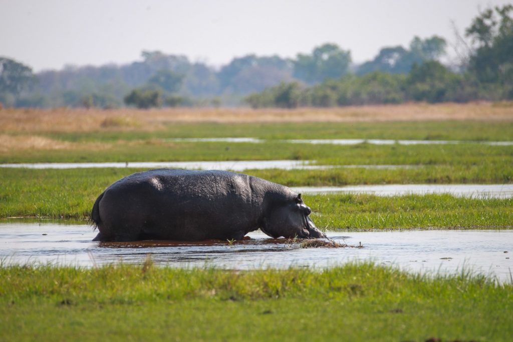 Arrivée à Khwai après 4h de piste, on installe le campement au bord d’une rivière magnifique, typique du delta, où vient brouter à notre grande surprise Solo, l’hippotame du coin, dans un vacarme effrayant la nuit.