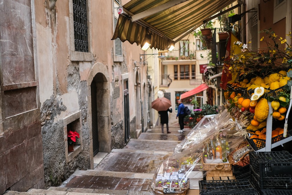 Le premier jour on fait les 40km qui nous séparent de Taormina pour aller découvrir cette belle petite ville à flanc de rocher au dessus de la mer. Le temps n’est pas trop avec nous pour ce premier jour et notre exploration est entrecoupée d’averses violentes, l’occasion de grincer des dents en buvant un café italien… Ici on a la vue sur la mer quand on sort des églises, la ville est tout en pente, dans un dédale de petites ruelles. Pizza pour se récompenser de l’effort avant de reprendre la route.