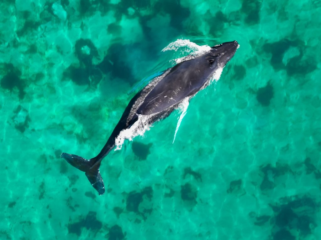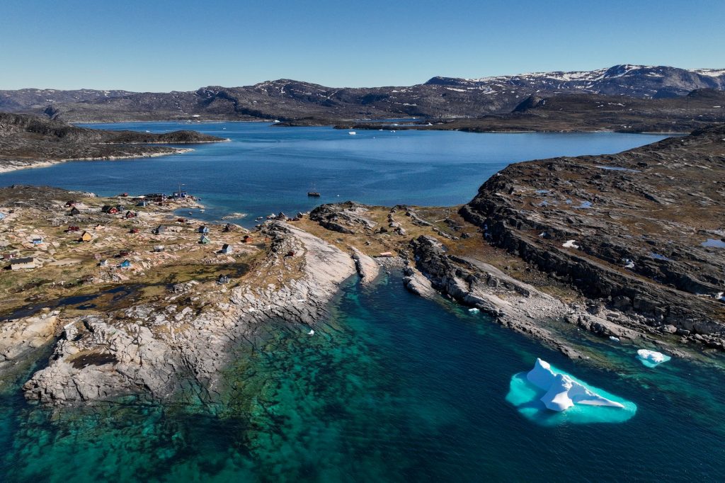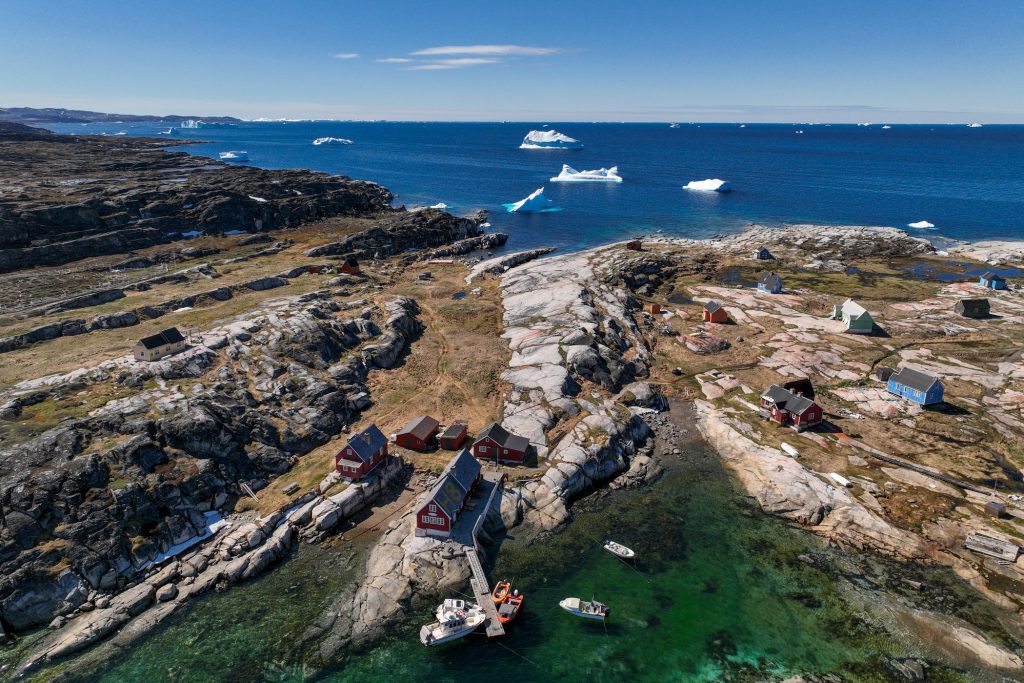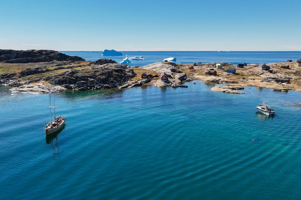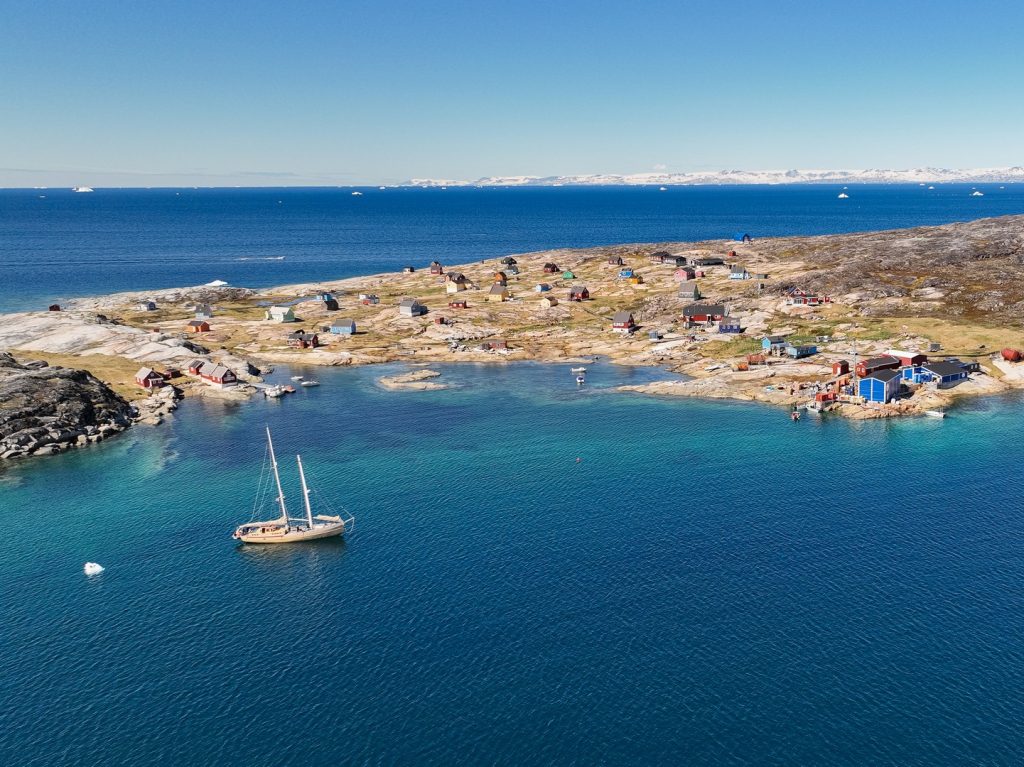 Nous prenons ensuite la direction du nord, on longe la côte au milieu des icebergs et des baleines au loin, jusqu’à s’engouffrer dans un petit chenal et pénétrer dans une magnifique baie toute calme devant un beau village typique, ancienne station baleinière. D’ailleurs une baleine entre dans la baie à son tour et je la survole en drone ce qui permet d’apprécier sa nage gracieuse au milieu d’eaux limpides, on se croirait en Corse si d’immenses icebergs n’y flottaient pas !