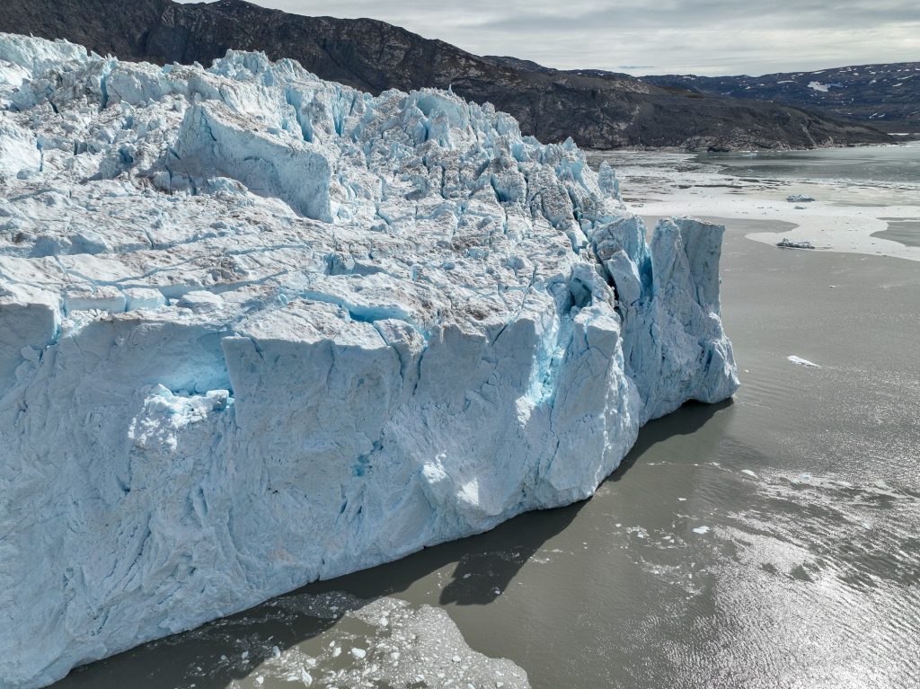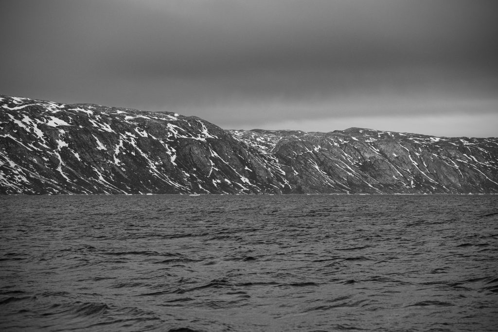 On continue notre navigation mais le second glacier voisin de quelques kilomètres, le glacier Kangilern. On est ici sur un style moins haut car la pente est beaucoup moins raide, plus en longueur mais tout aussi impressionnant. Des grondements toujours assourdissants. Une fois éloigné on peut prendre conscience de la quantité de glace derrière car on voit la calotte glacière qui descend en pente douce jusqu’au glacier, mais qui continue derrière à perte de vue.