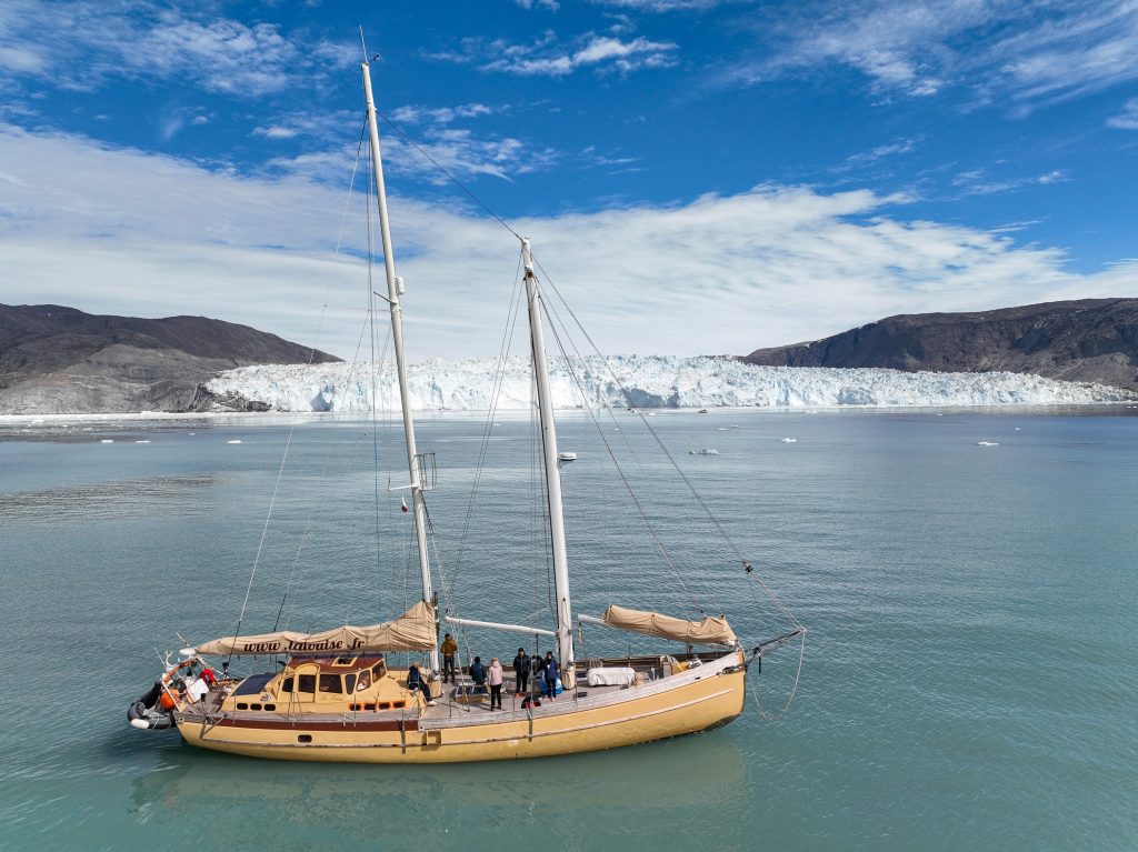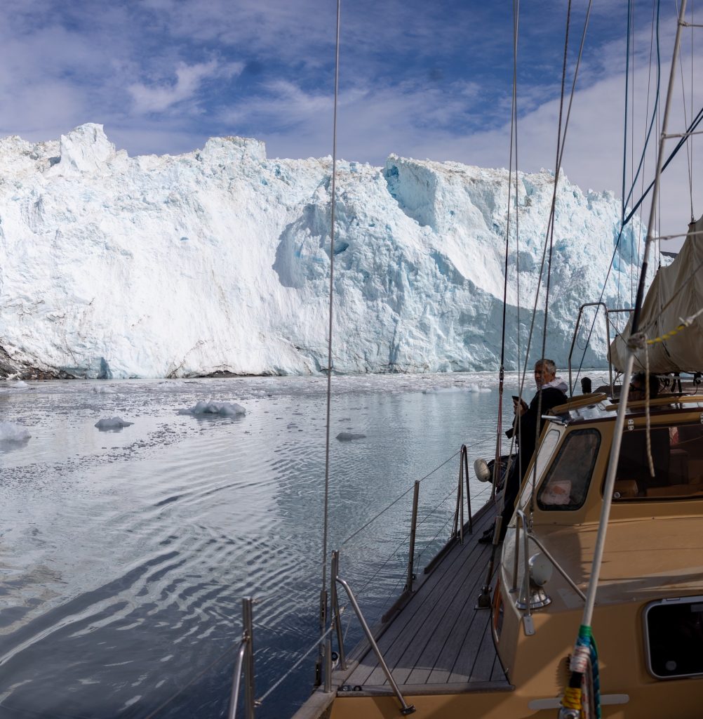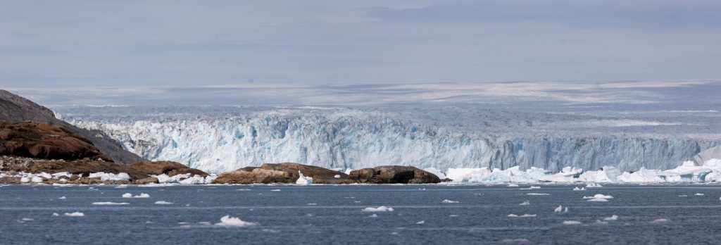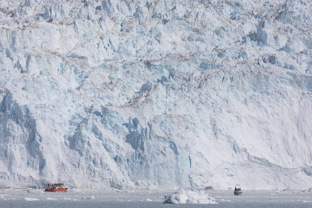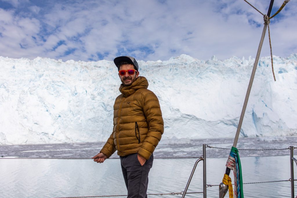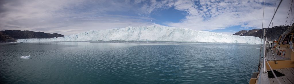 Réveil 8h comme chaque matin. Après le petit déjeuner on quitte notre baie en direction des géants du coin, les glaciers. Après environ 2h de navigation au milieu des icebergs toujours on arrive finalement en vue du glacier Eqi (prononcer Eri). C’est un monstre, on le voit clairement alors que nous en sommes encore à une bonne dizaine de kilomètres. On s’arrête pour déjeuner face à lui, nous en sommes encore à 3km alors que tout le monde aurait dit 1km max. Ici les impressions de distances et perspectives sont complètement chamboulées tant le glacier est long (5km) et haut (plus de 120m !).