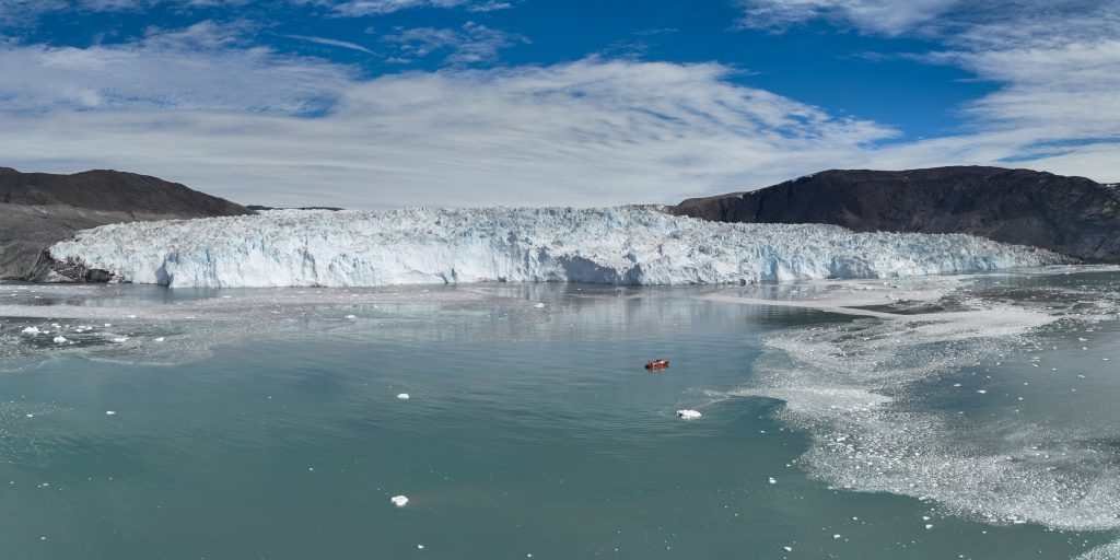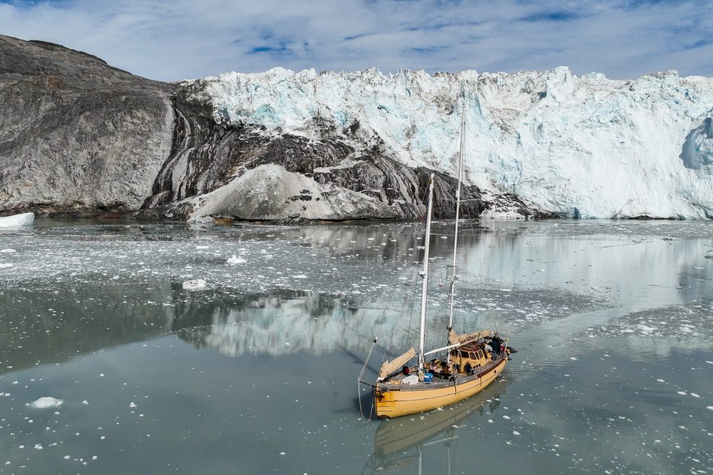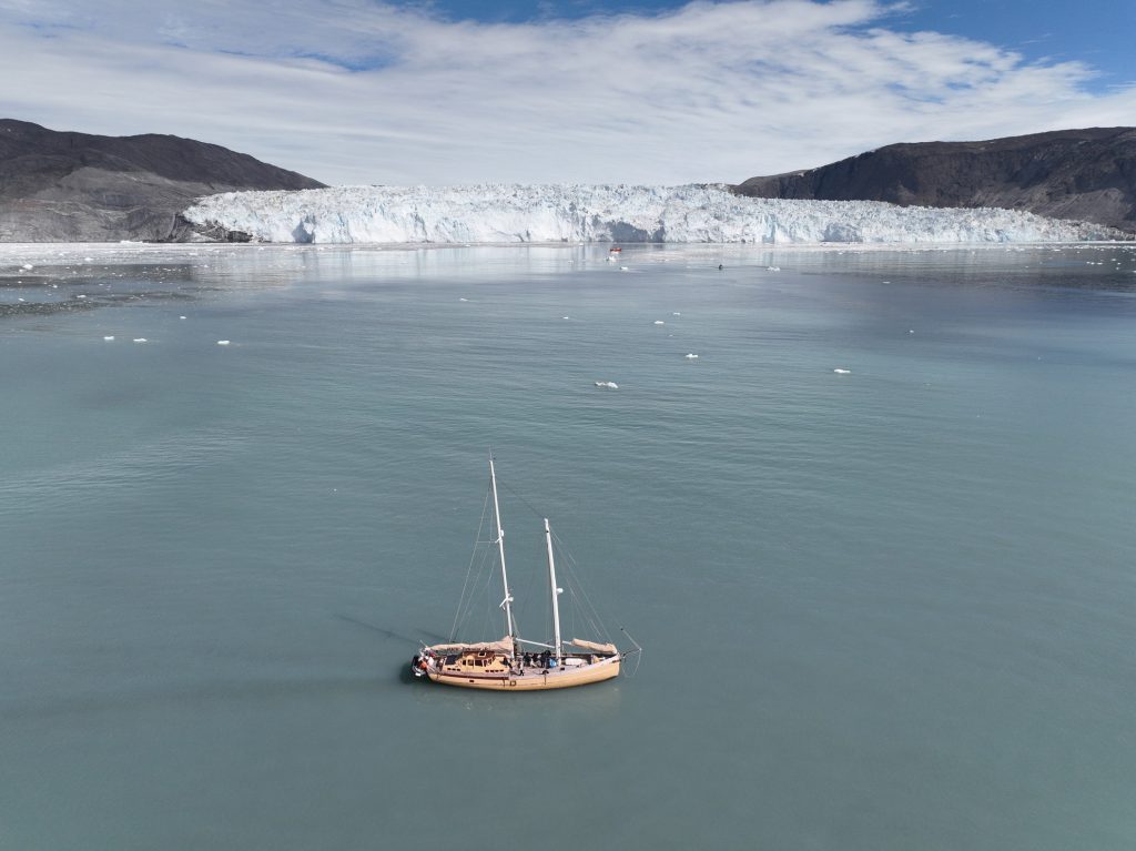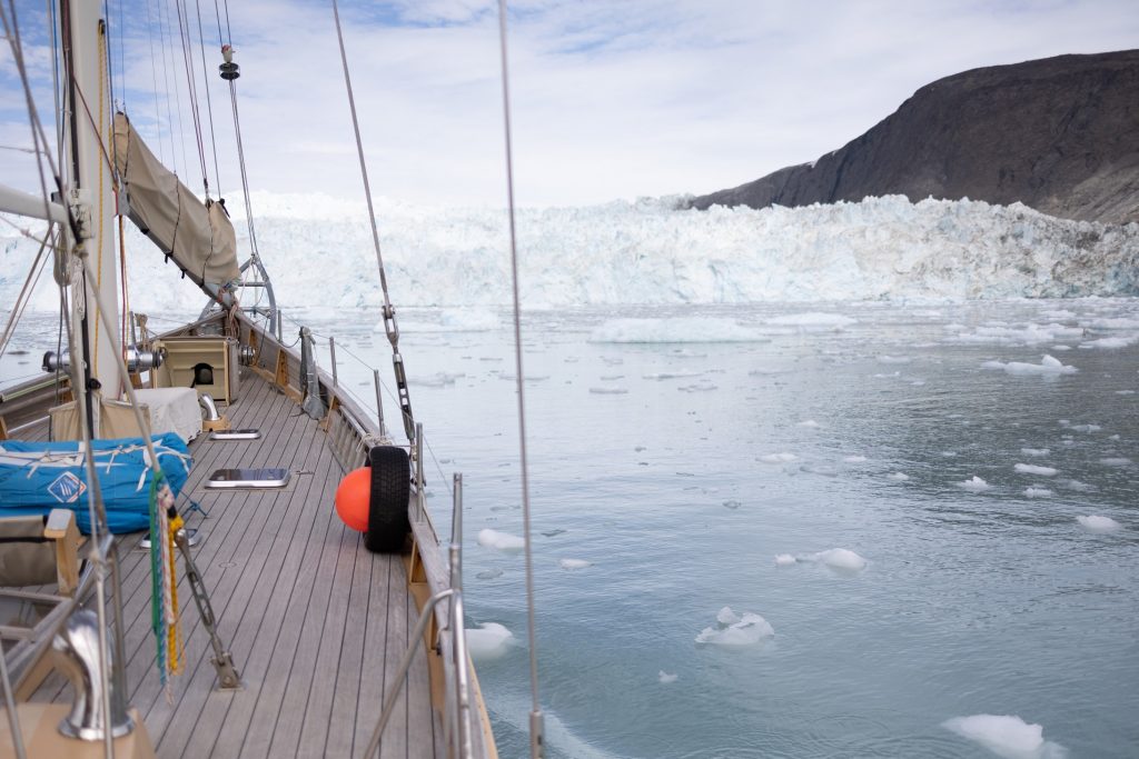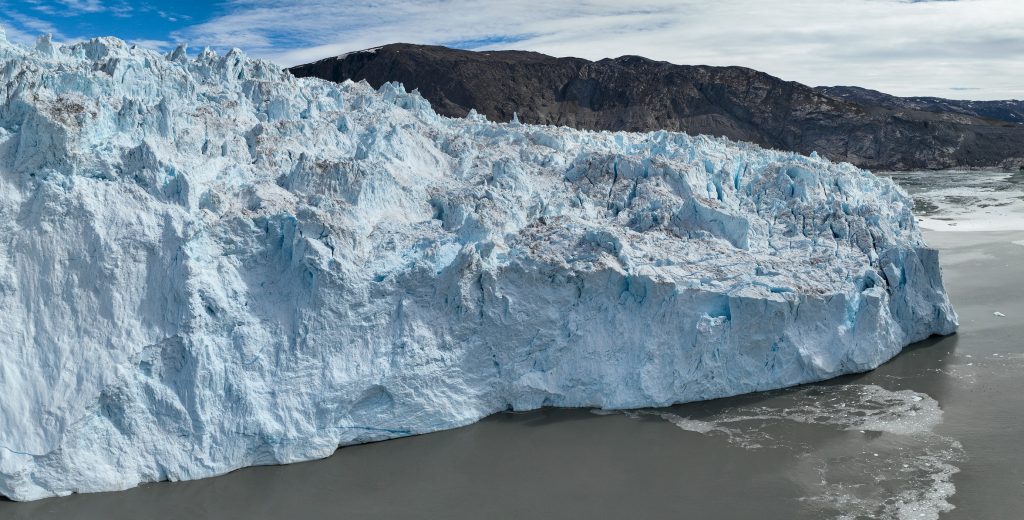Réveil 8h comme chaque matin. Après le petit déjeuner on quitte notre baie en direction des géants du coin, les glaciers. Après environ 2h de navigation au milieu des icebergs toujours on arrive finalement en vue du glacier Eqi (prononcer Eri). C’est un monstre, on le voit clairement alors que nous en sommes encore à une bonne dizaine de kilomètres. On s’arrête pour déjeuner face à lui, nous en sommes encore à 3km alors que tout le monde aurait dit 1km max. Ici les impressions de distances et perspectives sont complètement chamboulées tant le glacier est long (5km) et haut (plus de 120m !).