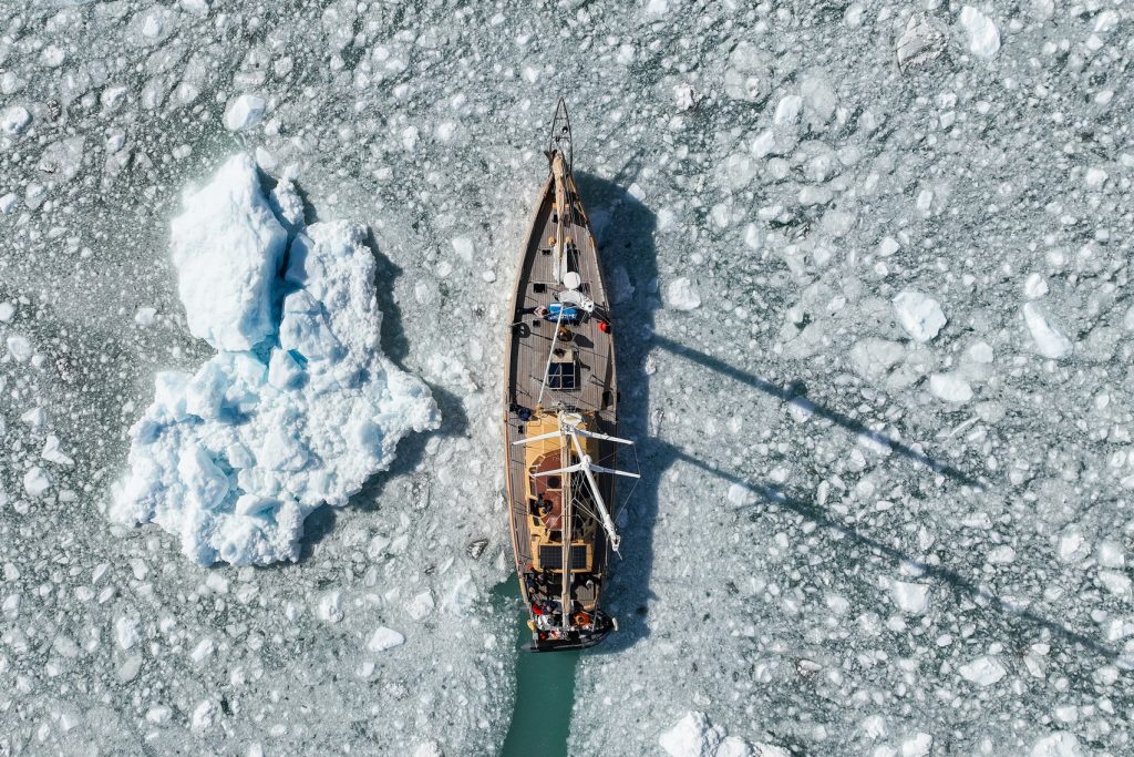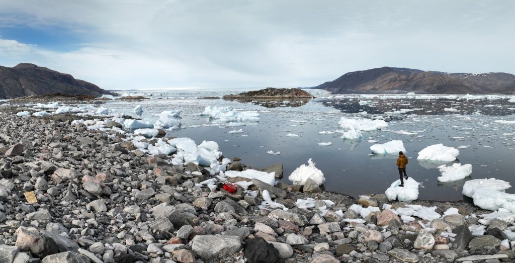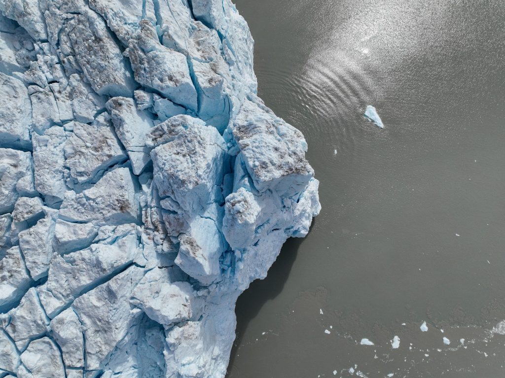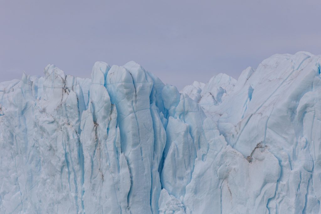 On se remet en route et nous passons finalement à moins de 300m de sa moraine, c’est complètement hallucinant de hauteur et de puissance. Le glacier craque dans des bruits assourdissants, on dirait l’orage alors que le temps est au beau fixe, c’est à la fois fascinant et terrifiant, parfois un bloc se détache dans un immense fracas. On navigue au ralenti en le longeant, ici pas question de s’arrêter et de couper le moteur, et nous avons largement le temps de contempler ces falaises de glaces, qui ont déjà bien baissé en hauteur et reculé, en témoignes les anciennes traces du glacier sur les rochers.