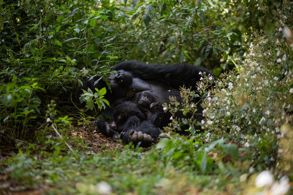 Parmi tous les individus de la forêt seules 6 familles ont été habituées aux humains et peuvent être approchées. Après environ 45mn de marche on nous fait signe de baisser d’un ton, un premier silverback, comprendre un gros mâle bien costaud, est sur une branche d’arbre juste devant nous, une femelle est allongée juste derrière au sol.