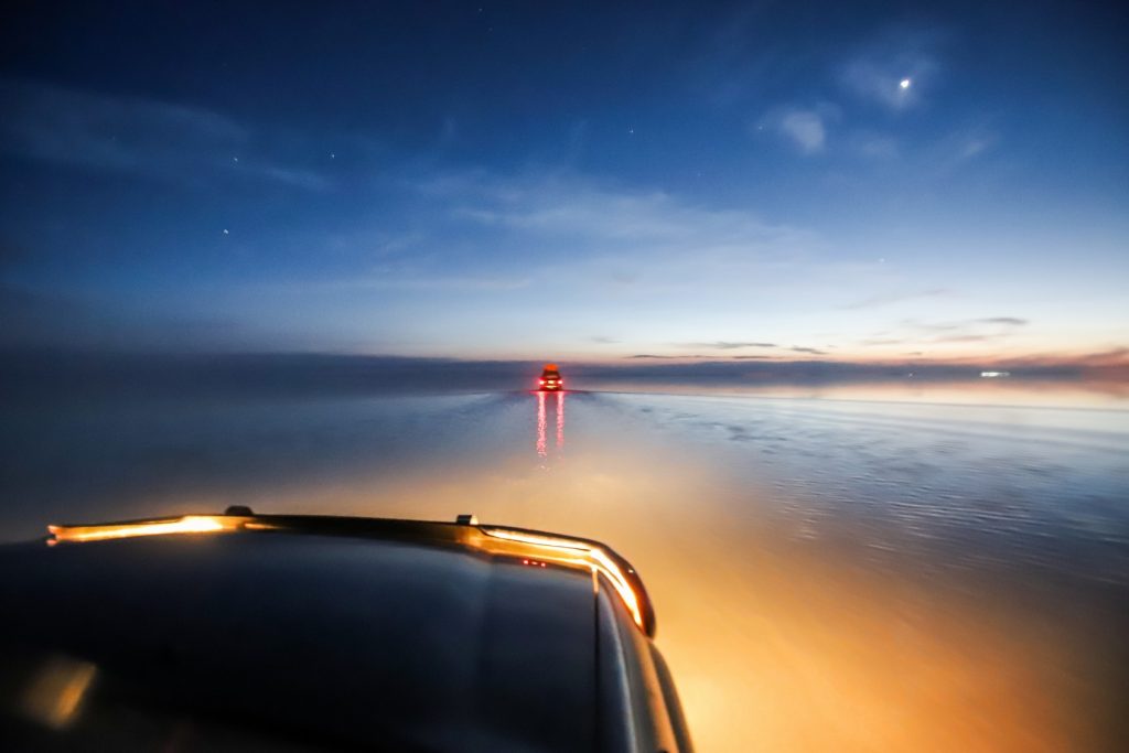 D’abord on roule juste avant le lever du soleil, une impression étrange de rouler dans le vide, dans l’espace, sans un bruit, on en perd nos repères.