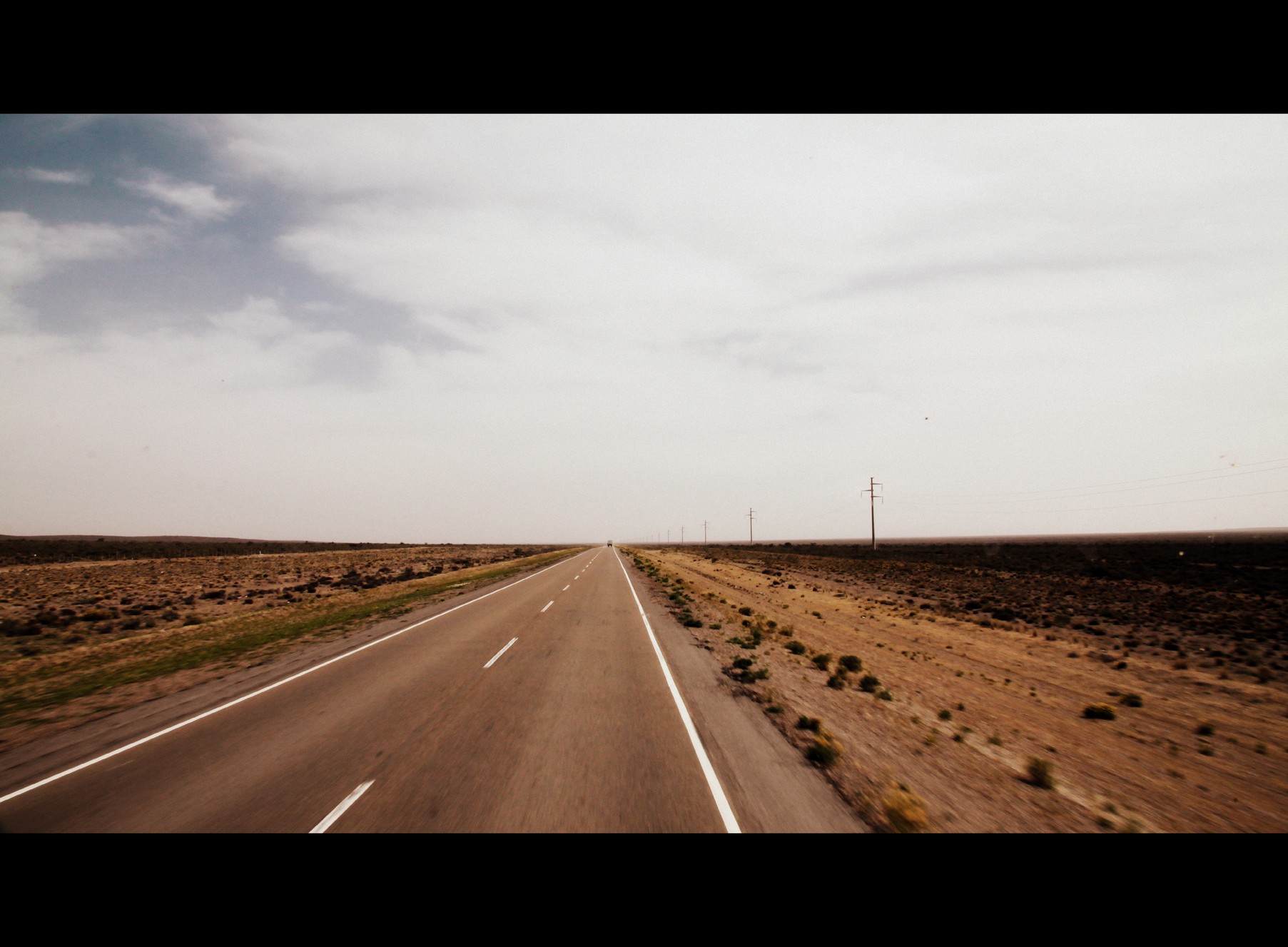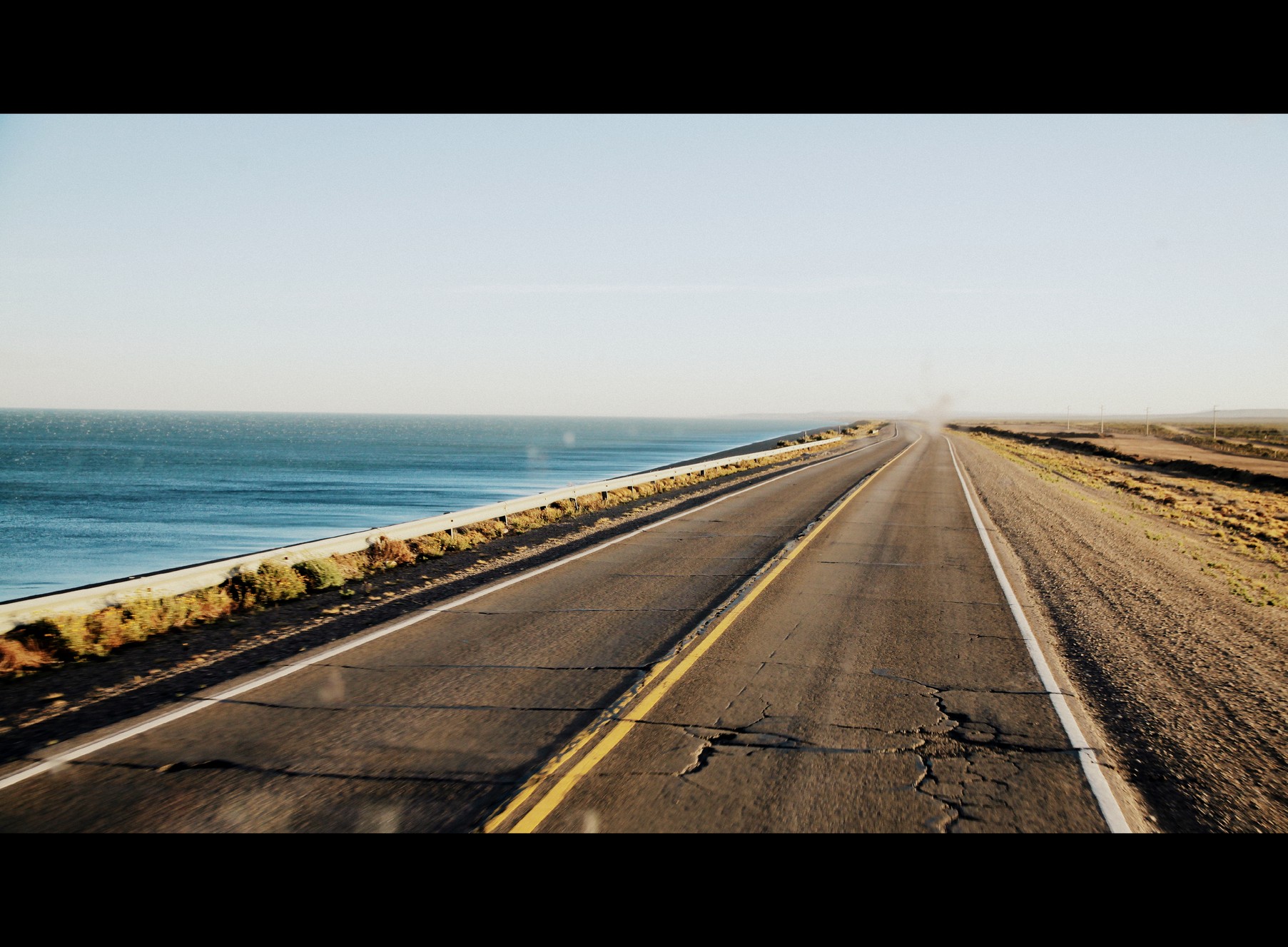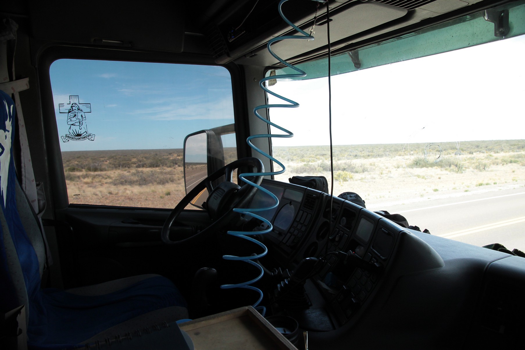 Adieu la Péninsule Valdès et les nanimaux. 16h de stop dans un gros camion avec Herman (100€ d’économie !) m’ont menées à Rio Gallegos. Ici le stop se pratique pas mal vu les distances, les prix des bus et la solitude des camionneurs qui demandent en fait pas mieux que de partager un peu de maté avec quelqu’un qui vient de l’autre bout du monde… En plus le paysage est chouette mais trèèèèèèèès mooooonoooootoooone et je sais pas comment il fait pour résister aussi bien à la fatigue (bon ok faut dire qu’il bricole pas mal, il faut le voir préparer le maté, sortir les plaques de cuissons, brancher, ranger, chercher les herbes, verser l’eau, fumer clopes sur clopes, régler des trucs et des fois regarder la route…) tout ça pendant que finalement je m’endors doucement.