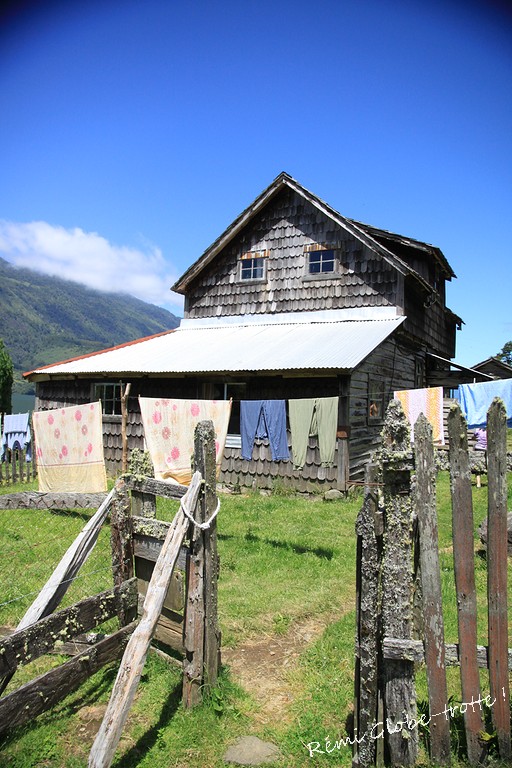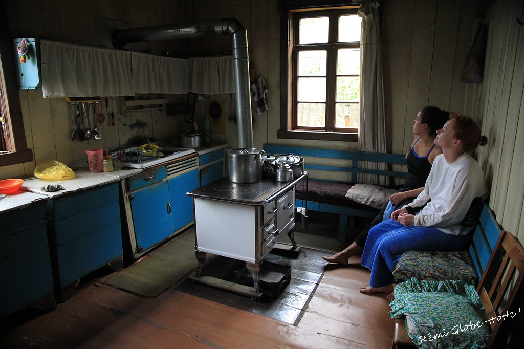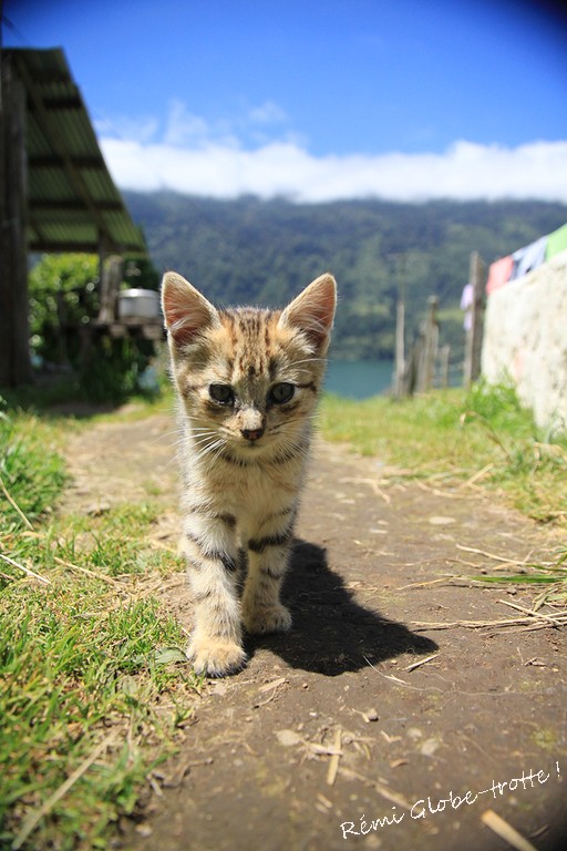 Après 3h nous arrivons dans une petite maison encore perdu dans les montagnes au dessus de la mer avec une vue incroyable sur les environs et le volcan au loin. Une mamie et son fils nous accueille merveilleusement bien dans leur maisonnette chauffée par la cuisine à l’ancienne que tout le monde utilise ici (cuisinière énorme mais très jolie, en fonte qu’on met au milieu de la cuisine et qui chauffe au bois). Ici encore plein d’animaux et une vie coupée du monde presque en autonomie. Rien que les œufs que nous prépare mamie sont délicieux, on voudrait y passer une semaine à se faire dorloter !