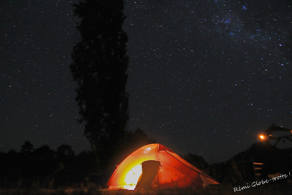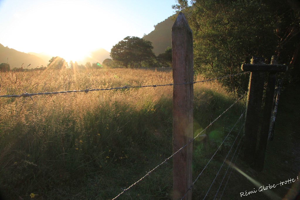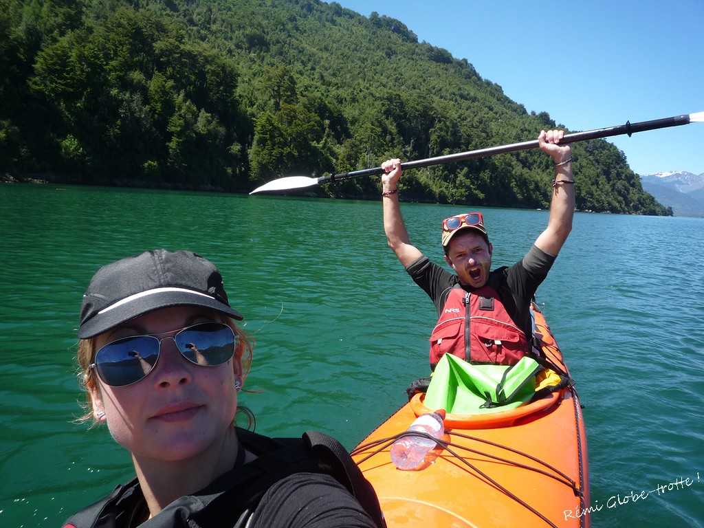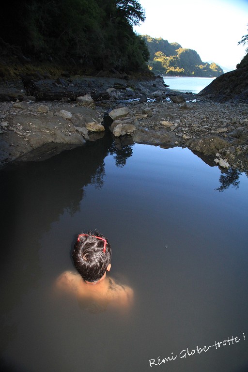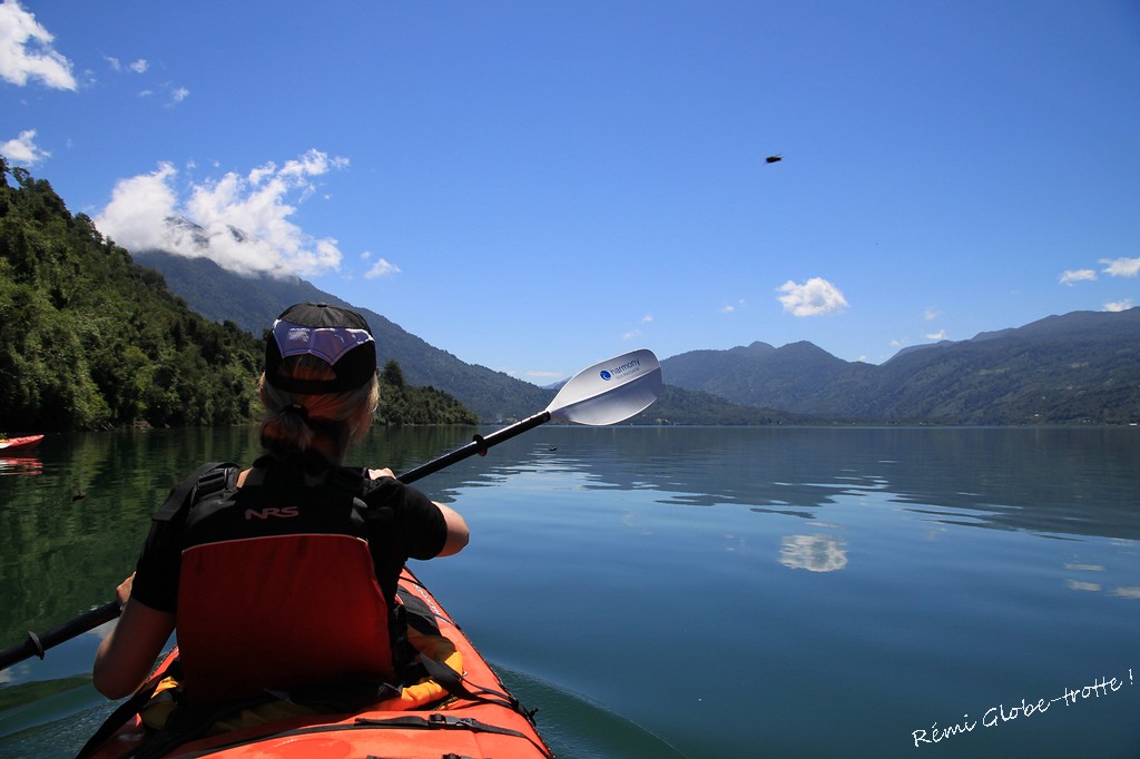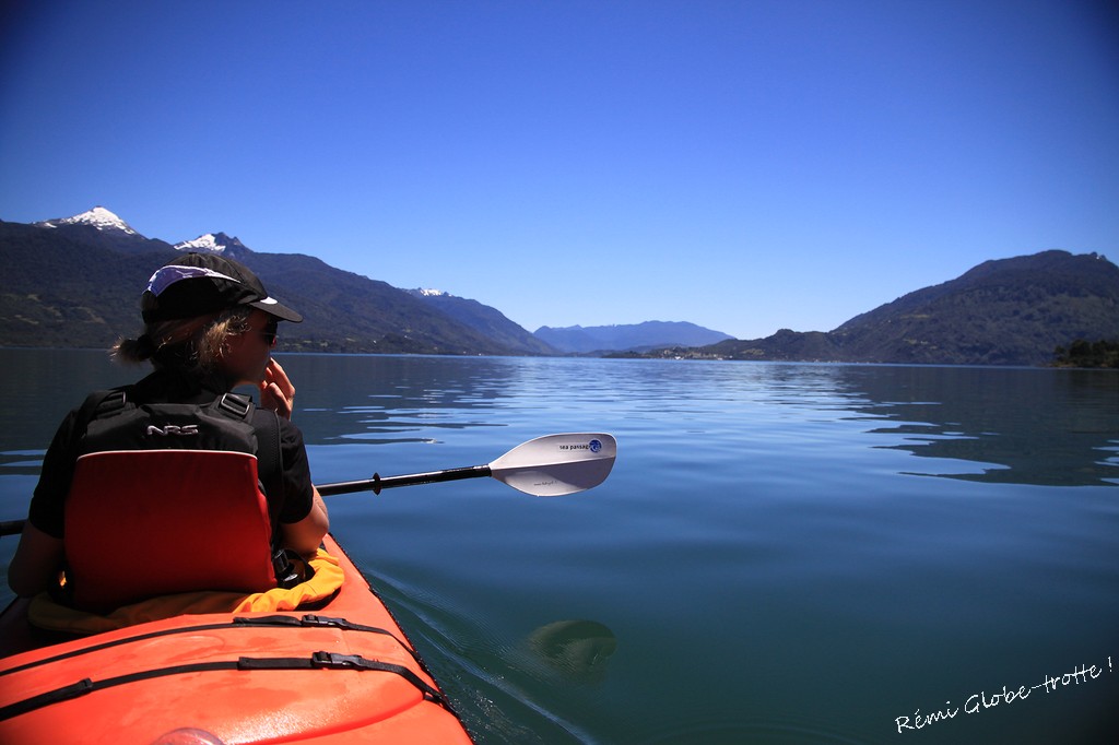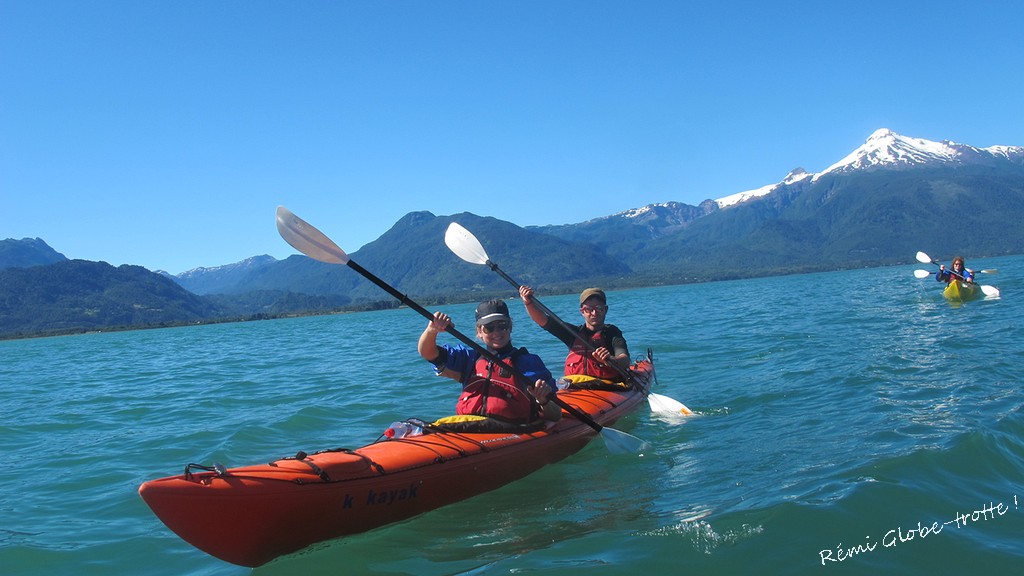 Le jour suivant on par en groupe avec 3 autres personnes pour un tour de 3 jours en kayak de mer dans les environs. Nous descendons d’abord une rivière qui vient se jeter dans le bras de mer qui rentre dans les terres jusqu’au village Cochamo. Le premier jour est un peu dur car nous sommes face au vent et au courant. On plante le campement dans une petite ferme, une famille qui vit quasiment en autarcie dans une petite maison avec une vue absolument imprenable sur le beau volcan d’en face. C’est-à-dire que le terrain vient se jeter dans le bras de mer, et en face commence la pente du volcan. On ne peut pas avoir de meilleure vue. Ils vivent ici avec quelques chèvres, moutons cochons poules, un grand jardin, derrière seulement de la forêt et même des sources chaudes à 10mn de marche ! On mange donc du bon poulet fermier, du pain maison avant d’aller se coucher sous un ciel incroyable.