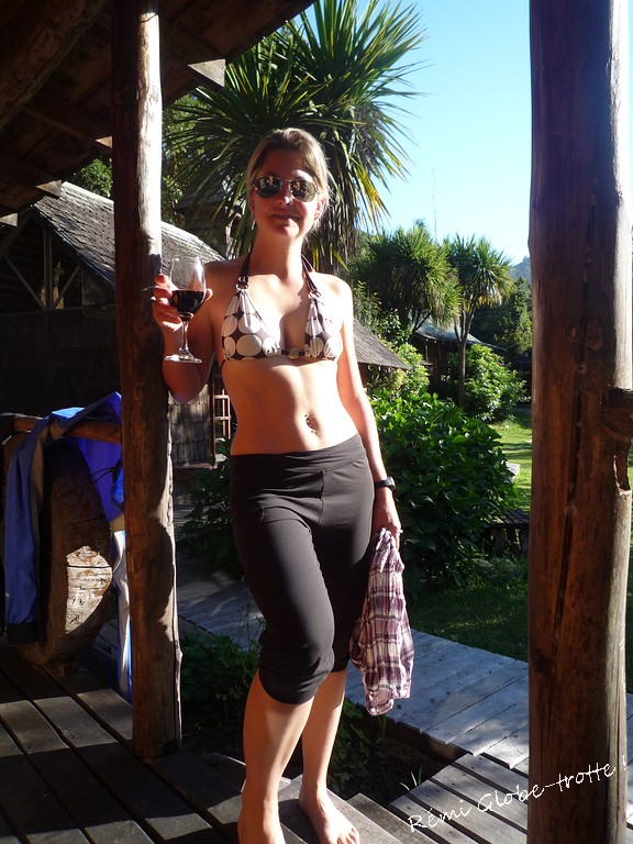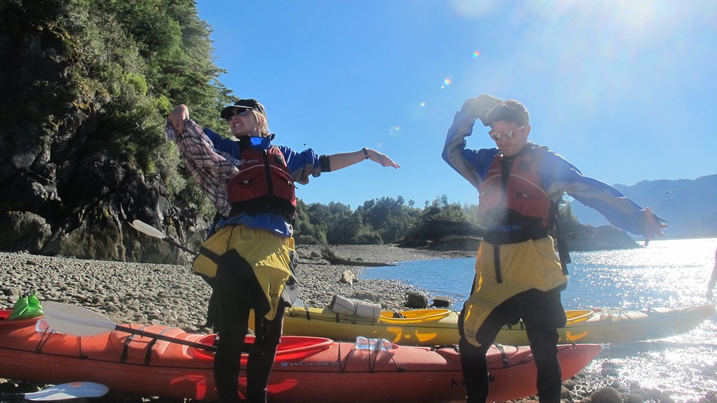 Le lendemain le temps est magnifique, on fait une vingtaine de kilomètres de kayak en remontant le même bras de mer au milieu des montagnes, on voit des pingouins, des dauphins et même des phoques se baigner autours de nous alors qu’il fait 30 degrés. La traversée est longue et c’est erreintés d’avoir ramé et de s’être battu avec des milliers de taons (oui ils viennent même en mer nous faire chier) que nous arrivons dans un chouette lodge pour passer la seconde nuit. Ici bon repas et bonne literie, le vin est offert et Mike qui s’occupe de tout ça nous explique un peu la vie dans le coin et nous montre au loin ses voisins vivant dans des endroits si improbables et coupés du monde qu’on aurait pas vu les maisons sans ses indications. C’est donc bien crevé qu’on va se coucher, avec notre beau bronzage de rameurs en combi…