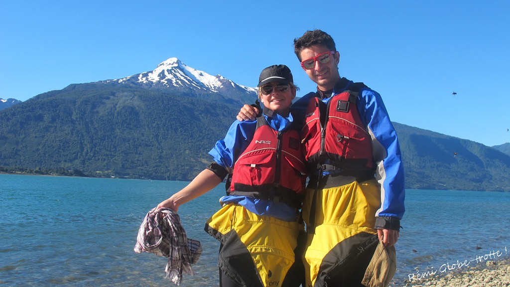Puerto Varas c’est un grand village à une vingtaine de kilomètres au nord de Puerto Montt. Au bord d’un magnifique lac que domine le majestueux volcan Osorno, un cône parfait avec juste ce qu’il faut de neige en haut pour qu’il soit trop beau. Nous sommes ici dans la région des lacs, un endroit où montagnes, volcans, mer et lacs et mêlent dans une végétation exubérante car il pleut une bonne partie de l’année. D’ailleurs c’est ce qu’il nous arrive les 3 premiers jours, pendant lesquels on ne fait pas grand-chose du coup. Mais enfin le soleil revient et c’est partie pour les activités, journée de rafting dans une rivière déchainée pour commencer. En fait le seul gros problème qu’il reste est la présence de taons. Une invasion, des milliers il y en a de partout c’est une vraie plaie, ils vous tournent autours sans discontinuer et vous piquent si vous vous laissez faire. Le phénomène dure 3-4 semaines à priori mais on est en plein dedans, ensuite ils meurent.