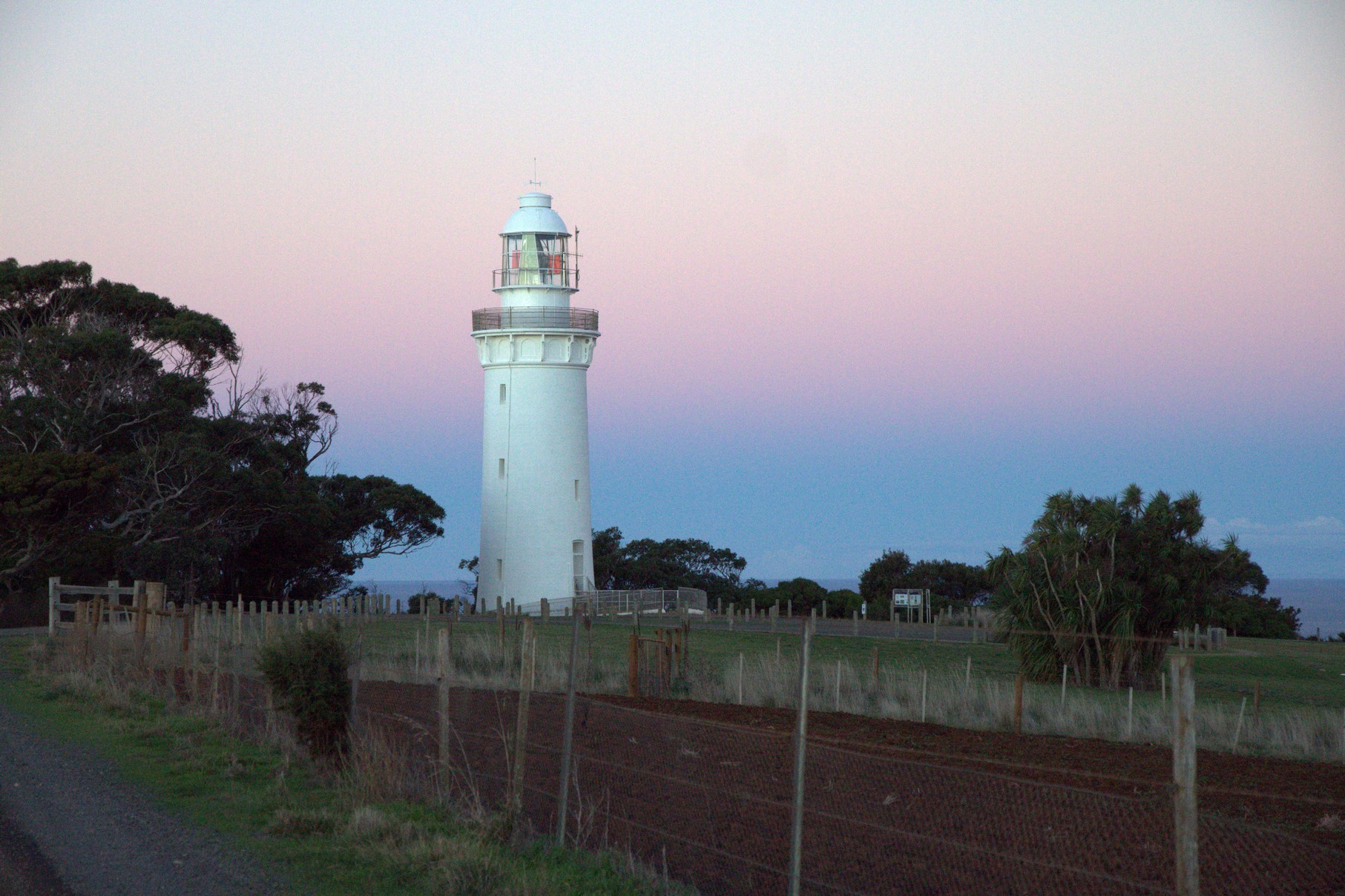 Nous arrivons pour le coucher de soleil (de plus en plus tôt hélas !) avec de nouveau la mer en face, dans la commune de Winyard. On se rend directement sur la péninsule pour aller admirer le beau phare qui est en train de recevoir les dernières lumières un peu rose avant d’enfin s’allumer pour alerter les bateaux de la présence des flics dans les environs (d’où les appels de phares évidement).