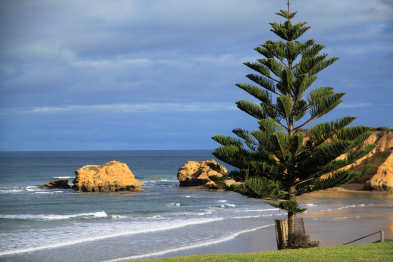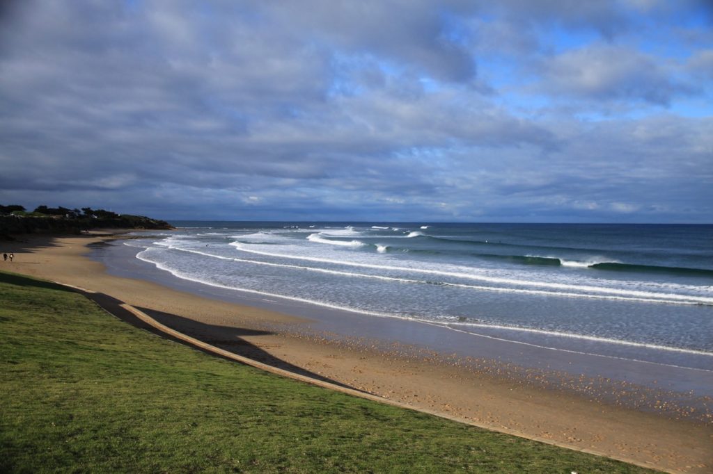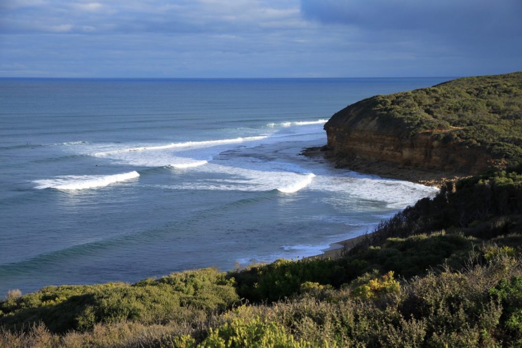 On part de Melbourne et on attaque la route, et voici la côte. La Great Ocean Road, c’est le paradis des surfeurs. De la grosse grosse plage sans fin, du sable et de la grosse vague. Du coup les villes qu’on traverse sont pleines de shops billabong, Rip Curl et compagnie.