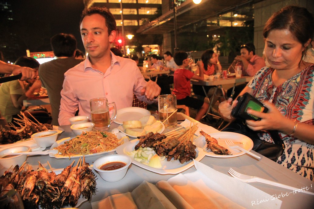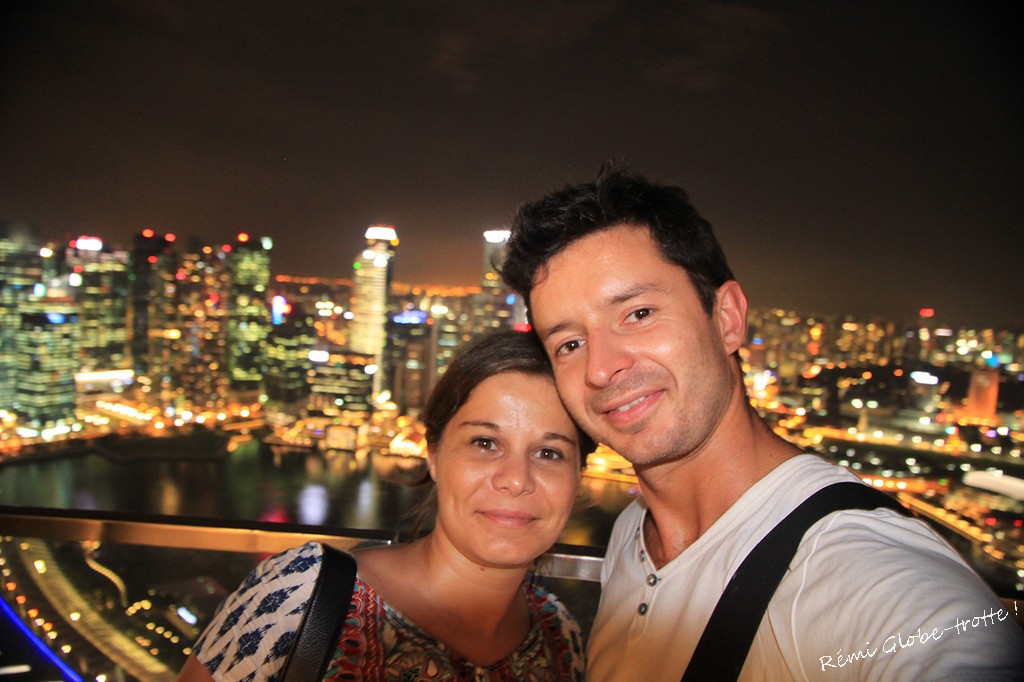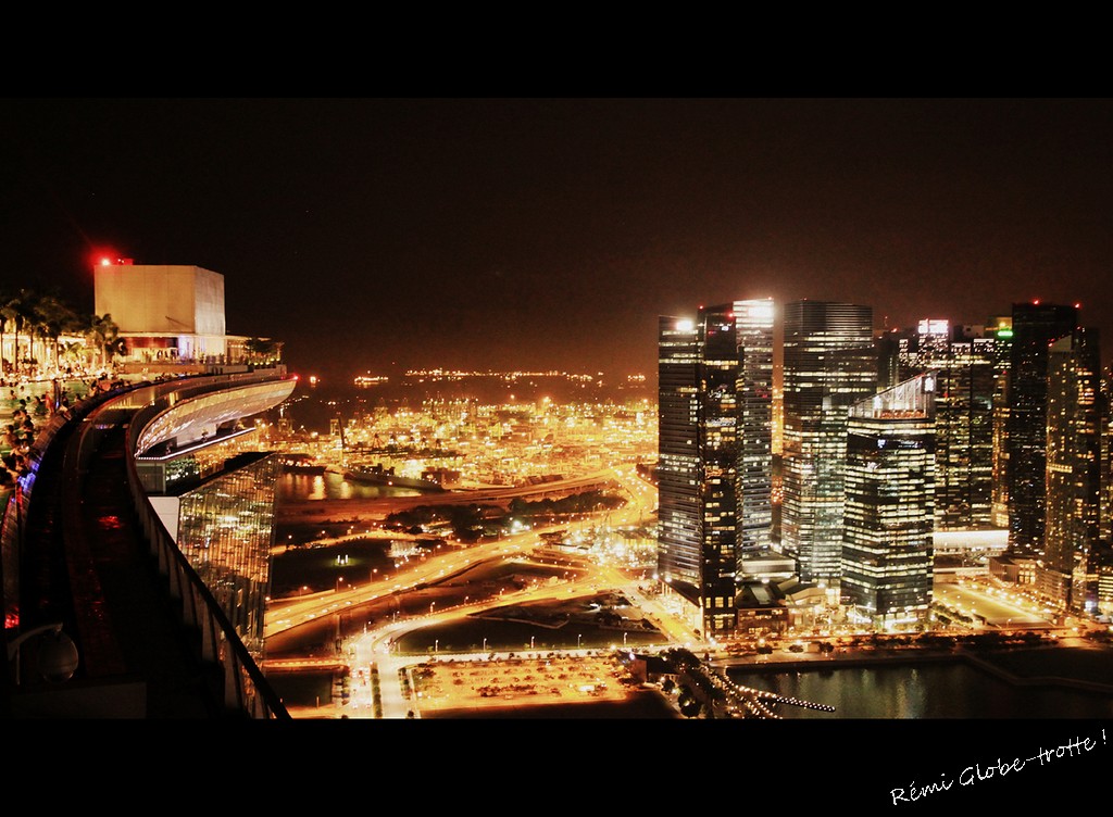 Le soir, en plein business center on ferme une petite rue au milieu des grattes-ciel et les vendeurs ambulants s’installent avec leurs stands fumants de brochettes, poulet, moutons, bœuf, gambas, tout y passe ! On fait une razzia c’est délicieux puis on repart à l’assaut d’un gratte-ciel pour boire un verre : un hôtel gigantesque à l’allure d’un immense bateau posé sur trois buildings. Délirant, on sait pas comment ils ont pû avoir cette idée et construire çà mais on ne peut être qu’impressionné. Tout en haut à près de 200m une immense piscine donne sur le rebord du building, ils sont fous je vous dis…