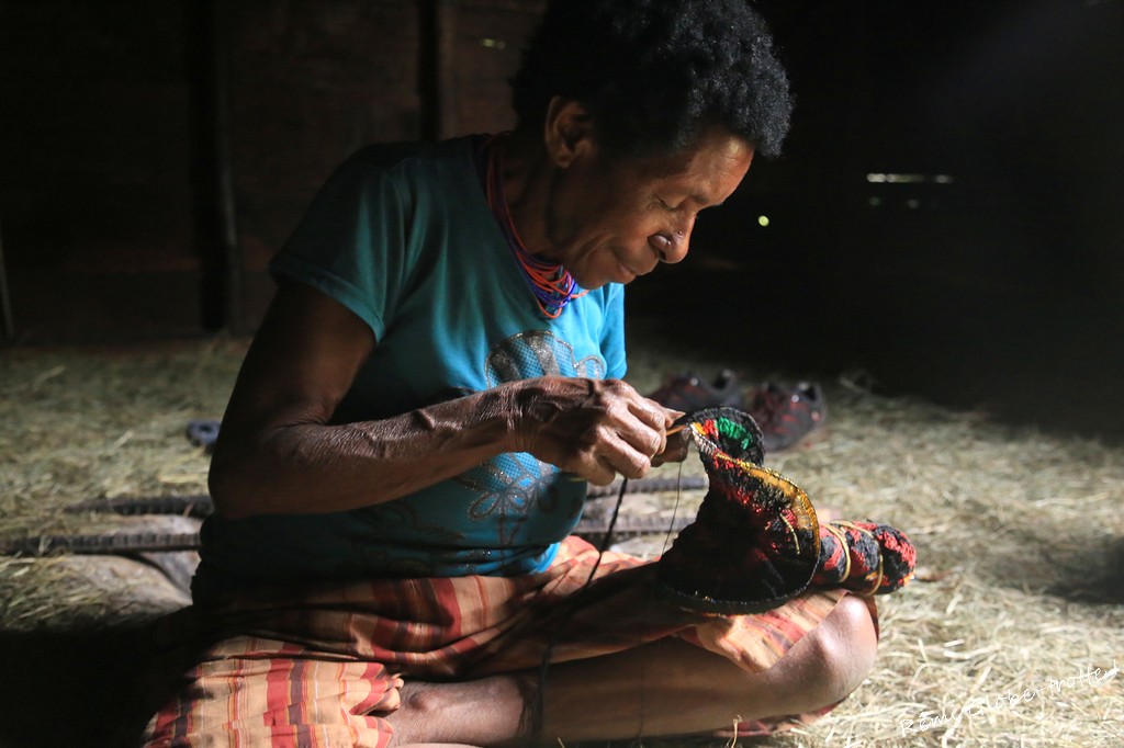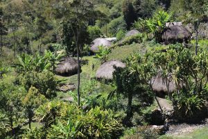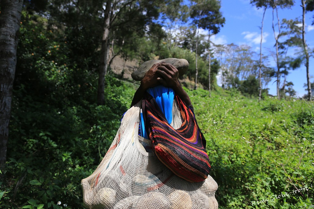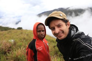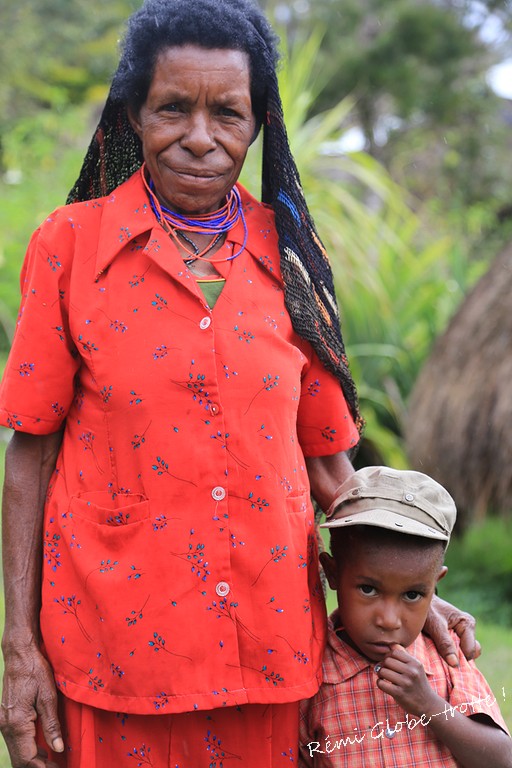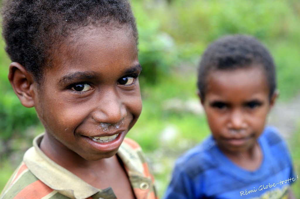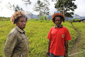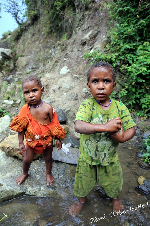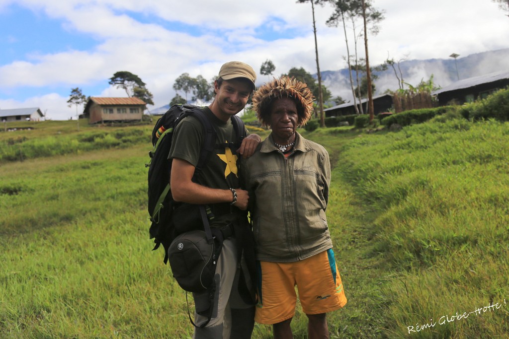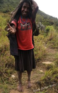 Les gens sont presque tous pieds-nus. Quand je dis pied je devrais dire palme-de-corne. C’est incroyable. Ils ont vécu pieds-nus toute leur vie dans la montagne, leurs pieds sont donc très large et complètement insensibles aux caillous, graviers ou clous si il y en avait. Je vois mes premiers papous tout nu. Simplement vétus de leur Koteka, cet étui pénien de couleur orange et de leur couronne de plumes. A kurima heureusement pour moi une indo vend encore quelques bouteilles d’eau hors de prix et quelques noodle.