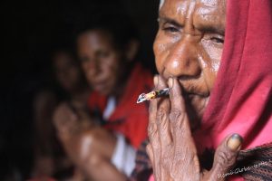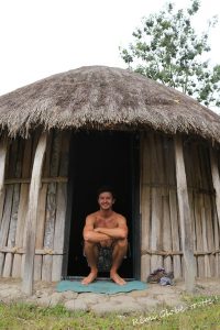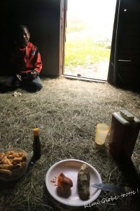 Le soir je rejoins la famille autours du feu alors que le temps se gâte et se rafraichi, la hutte est pleine de fumée mais ca rechauffe. Il est 18h, directement on me tend une patate douce encore brulante, ici on mange avec les mains, on pêle avec les ongles. Comble du luxe, j’avais prévu une bouteille de sauce soja et des biscuits qui régalent mes hôtes. 19h, tout le monde file dormir, de toute façon ca tombe bien, j’ai rien à faire et ma journée à commencé à 3h30 ce matin !