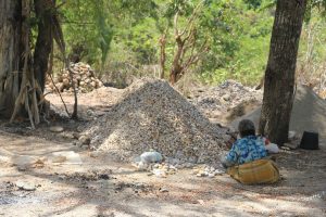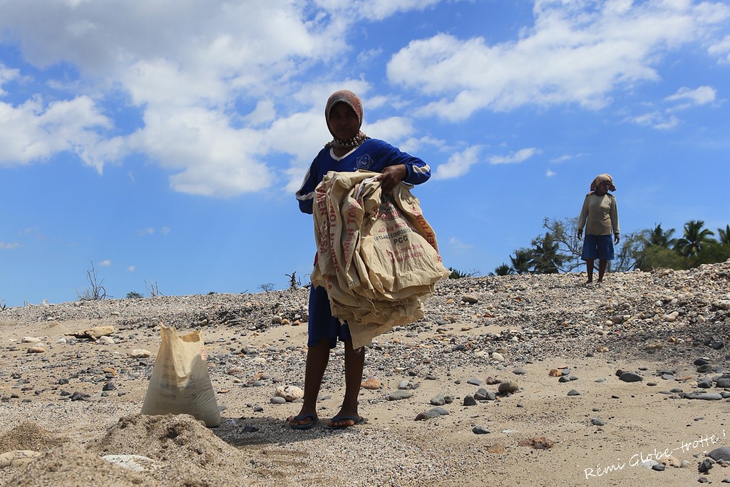 Sur la route le long de la côte, il y a des fabriques de gravier… Ce qui consiste en 2 ou 3 femmes qui font des sac de pierres depuis la plage et une mémé qui casse les cailloux avec un pti marteau…