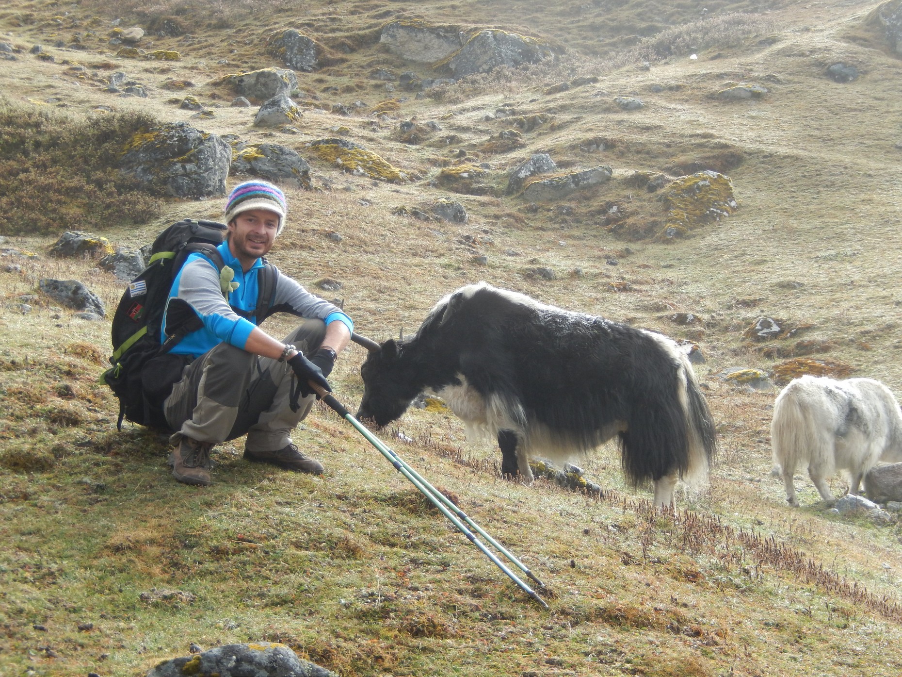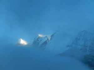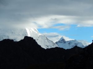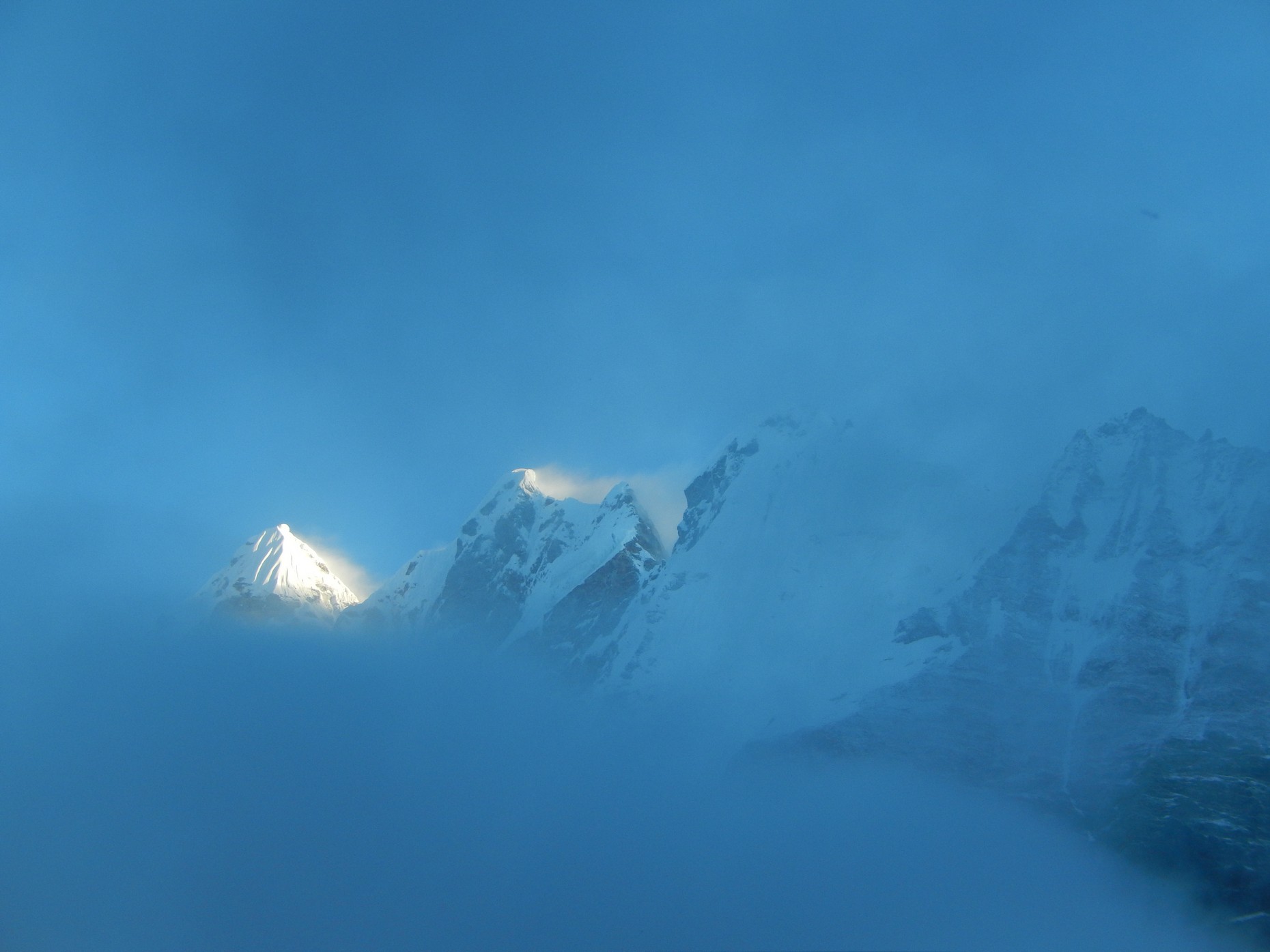 Au matin je vois le sommet du Langtand depuis ma fenetre, il capte les premiers rayons du soleil a travers les nuages quelques 3500m plus haut ! Le temps de faire quelques photos pour prouver que le monstre est la et on prend un sac ultralight pour partir affronter le Kyanjin Ri a 4600m. Sur le chemin alors que les yaks paissent a des altitudes folles (et ils courent eux les slauds) la couche de nuages se fait plus mince et on voit nos premiers sommets enneiges ! On se prend a esperer que le temps sera sympa une fois arrives en haut mais quenini canaille une fois rendus on ne voit plus rien… Je fais le pied de guerre une heure, j’ ai prevu des vetements et du fromage pour tenir le camps mais rien n’y fait et de desespoir on rentre… On aura juste eu droit au glacier du Langtang et a d’ inquietantes silouhettes a travers les nuages…
