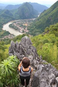 Nong Khiaw charmant village au bout de nulle part, au milieu des montagnes calcaires en forme de pains de sucre. Avec sa rivière qui le partage en deux on se croirait vraiment a Guilin en Chine. On monte au point de vue local pour admirer la vue et se rendre compte a quel point on est perdu. Les montagnes tout en pics karstiques sont raides et aiguisées comme des couteaux et ne laissent une place dans le paysage que pour laisser passer la rivière. C’est donc en bateau qu’on ira visiter les villages plus au nord et découvrir de belles cascades, des rizieres et des gens qui vivent loin de tout.