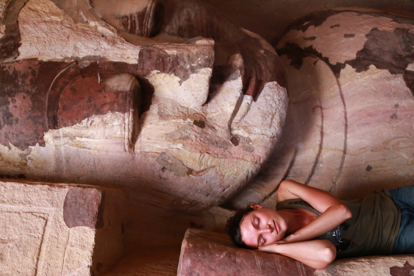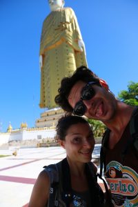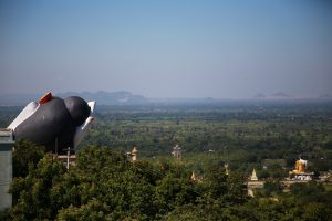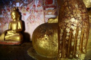 Le lendemain on traverse l’Ayeyarwady, ce fleuve immensément large mais aujourd’hui très sec. Interdiction aux étrangers de traverser avec les locaux… il nous faut donc payer le bateau entier pour 2 alors qu’ un bateau part en meme temps a cote avec une vingtaine de locaux ! De l’autre cote même chose, impossible de se rendre ou on veut en bus ou en moto comme tout le monde alors il faut qu’on prenne une jeep (bien plus chère évidemment). Oui des fois la Birmanie c’est lourd ! Nous voici enfin a Po Win Dhaung, un ensemble de plusieurs centaines de petites grottes creusées dans une falaise calcaire et contenant chacune oui bravo vous l’aviez deviné, des bouddhas… couches assis debouts, il y en a pour tous les gouts ! L’ensemble est joli et la présence des singes et des arbres qui poussent un peu partout donne un petit coté « Angkor » très sympathique…