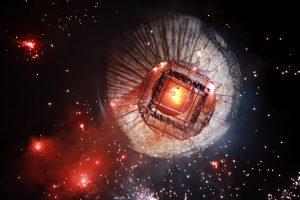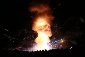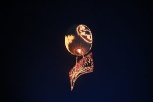 Petit a petit le ballon s’élève a grand renfort de coup de flammes sous la voile et finalement les cris de victoires annoncent le vrai départ. La montgolfière qui n’a personne a bord monte puis commence a se vider de son chargement, feux d’artifices dans tous les sens au dessus des gens hystériques ou alors elle lâche progressivement de petites chandelles en parachutes qui la suivent formant une longue traînée brillante dans la nuit. Le spectacle est vraiment chouette.