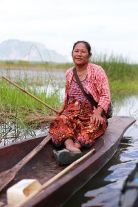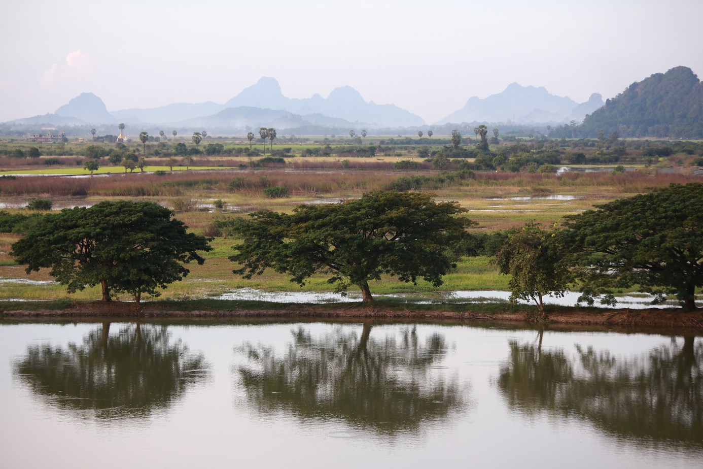 Nous sommes sur une barque a moteur qui remonte tranquilement le fleuve en direction de Hpa An. Le ferry n’existant plus on a decide de partager un bateau avec d’autres touristes histoire de quand meme profiter des beaux paysages du trajet. Ici le fleuve fait de larges virages au milieu des plaines. De gros pitons rocheux sont posés un peu partout de manière improbable et donnent tout le charme au paysage.