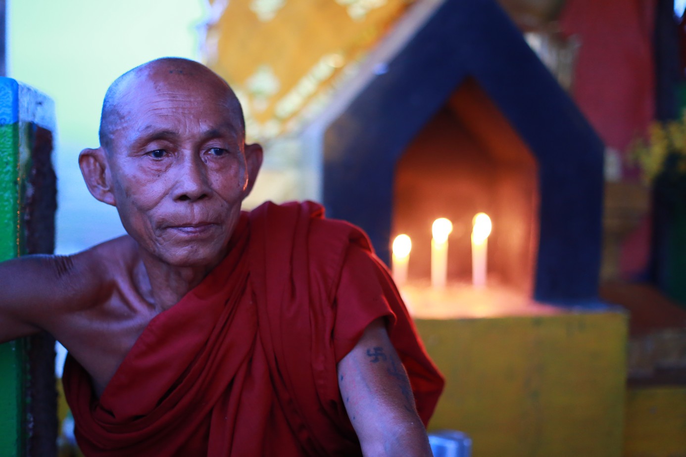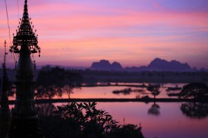 Paysages bucoliques, petits ponts, rizières, moines qui travaillent le long des routes, ici tout est photogénique et la moto est vraiment un bon moyen d’aller voir juste ce qui nous intéresse. On visite des grottes carrelées et remplies de bouddhas et profitons du coucher de soleil sur le mont Zwegabin. On traverse une espèce de long pont au dessus des rizières inondées, large d’environ 80cm, en béton sans barrières au deux sur le scooter. Grosses sueurs froides, suivies du genre de question : « mais qu’est ce que je fous laaaa ??? ».