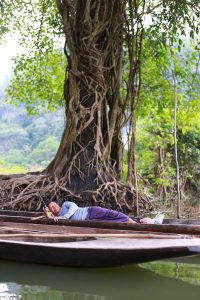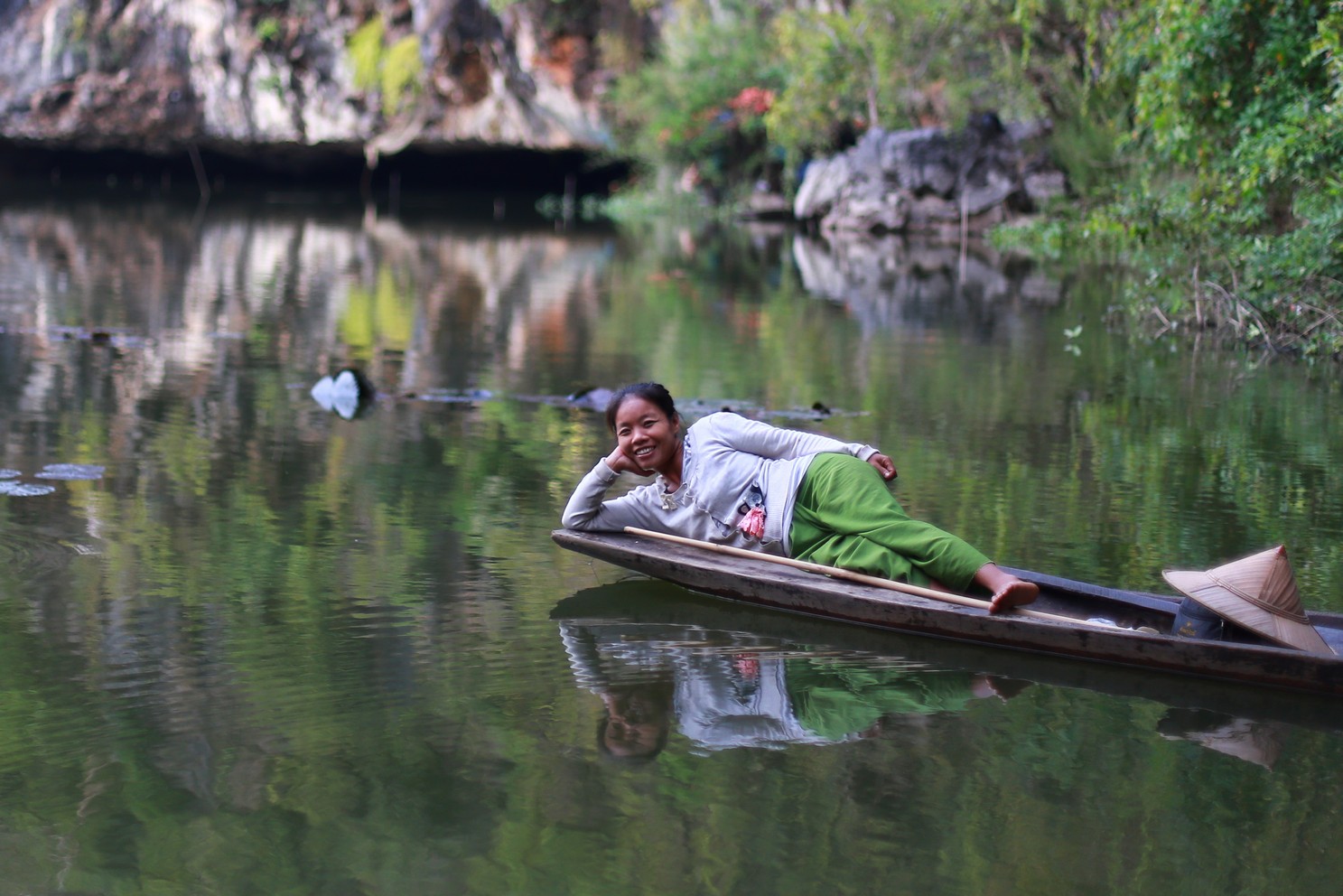 Les grottes sont vraiment belles, immenses. Bien sur ils ont craqués et quand même mis quelques bouddhas a l’entrée mais la balade est sympa. Peut avant l’arrivée on se retrouve dans le noir, électricité coupée mais le bout du tunnel n’est pas loin et on débouche finalement a la sortie, près de la rivière dans un petit coin absolument mignon ou les barques nous attendent pour remonter la rivière et nous ramener au point de départ.