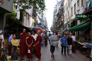 Beaucoup de traffic, de gens dans les rues, tout se vend tout se trouve sur les trottoirs, on traverse par exemple la rue bricorama, bijoux-street, boulevard des fruits, impasse des brochettes, trottoir des souvenirs pour visiter finalement le lieux le plus sacré du pays, la pagode Shwedagon.