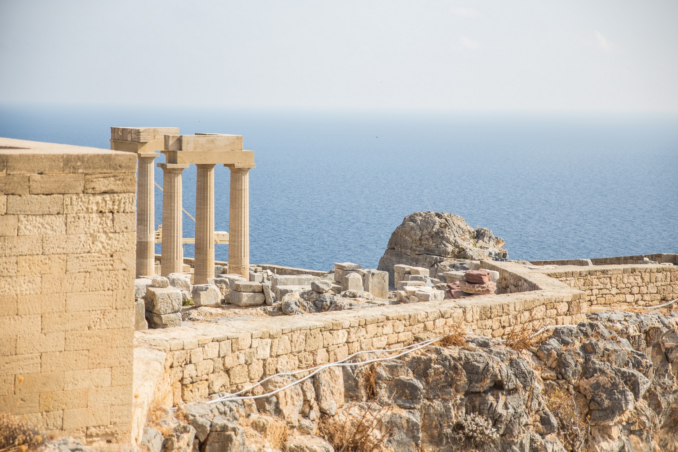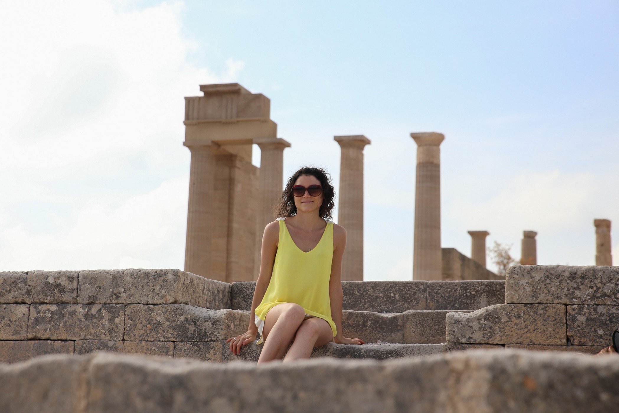Le lendemain je me lève à 7h, pas envie de rater le lever du soleil qui devrait se lever face à la terrasse. Il fait déjà chaud je suis torse nu alors qu’il se lève enfin face à mon objectif et mon regard comateux. Un chat avide de caresses et de rayons chaud partage ce moment avec moi avant de retourner auprès de Marjolaine me recoucher un peu ! Au second réveil donc, après un petit déjeuner face à la mer, nous partons à l’assaut des 116 m du roc de l’Acropole. Heureusement elle est moins bien gardée qu’à l’époque ! Maintenant un chemin part de la ville jusqu’au sommet où une femme affable vous accueille et vous remercie d’un « NEEEXT » en vous ayant soulagé de 6€. Quelques touristes hélas dans les ruines de l’acropole, mais la vue est magnifique ! Le site est resté assez naturel bien qu’en travaux. Les vestiges du temple d’Athéna font face à la mer qui s’étend à perte de vue, il fait toujours beau et chaud et on aurait bien envie d’y plonger à nouveau.
