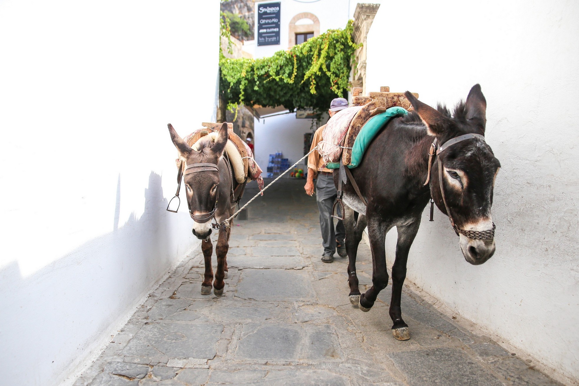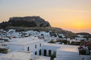 Au détour d’un virage on sait que nous sommes arrivés. Splendide vue sur la mer Égée et la baie de Lindos : un village blanc immaculé dominé d’une immense forteresse. On arrive tout juste pour capter les derniers rayons du soleil qui se couchent sur l’Acropole. Le vieux village de Lindos et son pêlemêle de toits blancs immaculés est également interdit au voitures. On débarque donc notre valise et partons dans ce nouveau labyrinthe. Heureusement qu’on nous a bien indiqué, nous tombons directement sur l’hôtel, cette fois-ci il aurait été bien difficile d’entrer une adresse en caractères grecs dans le GPS !