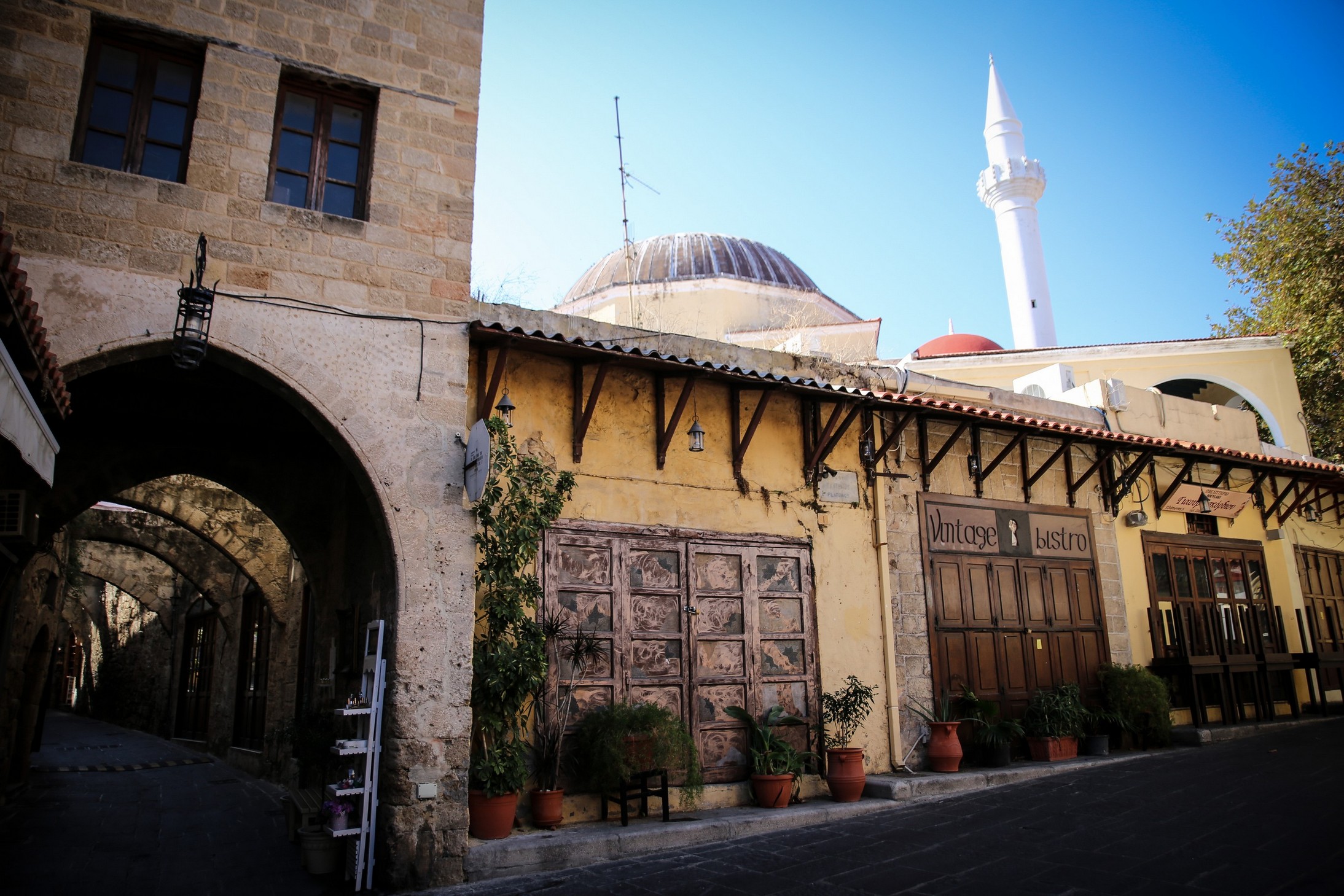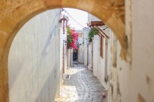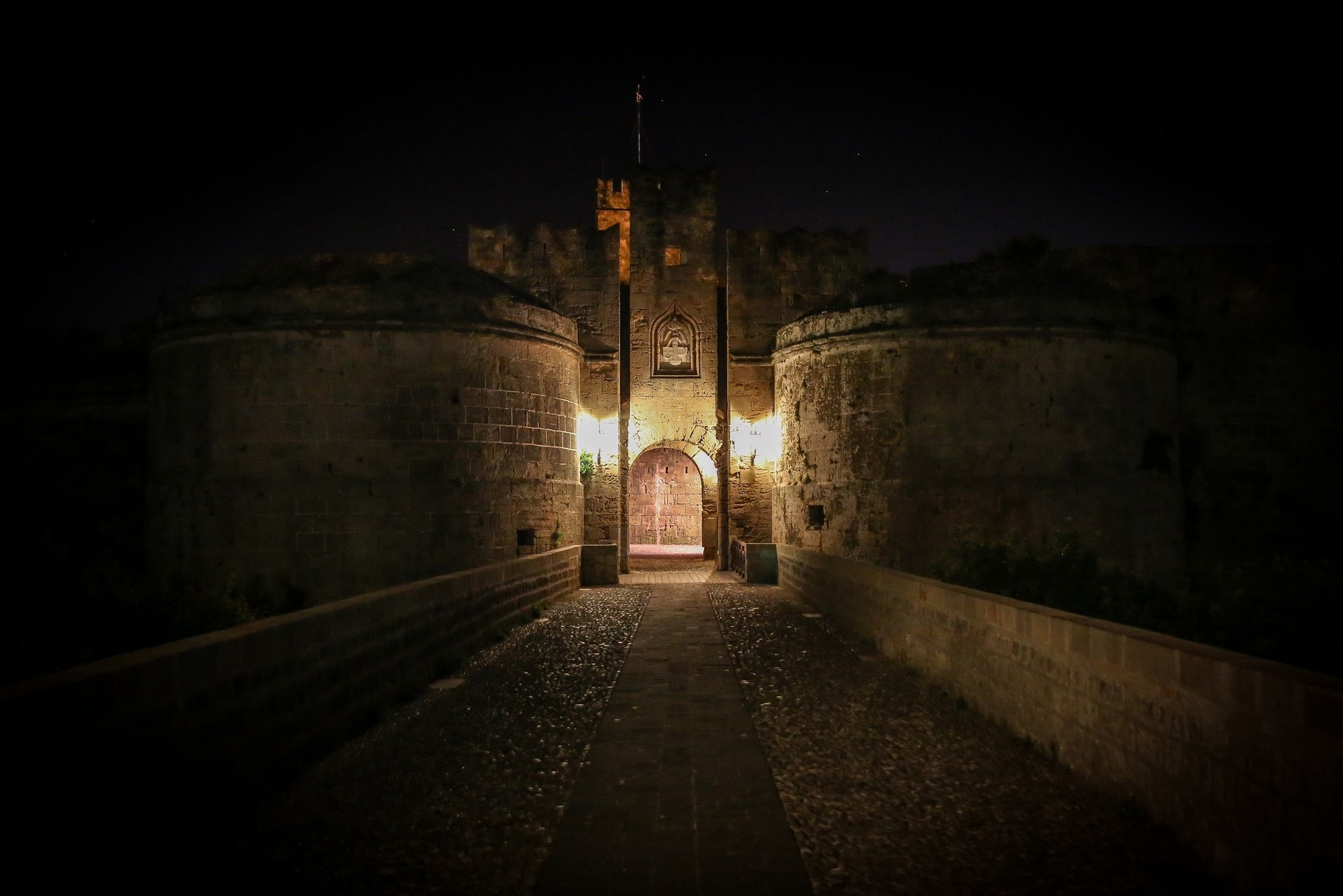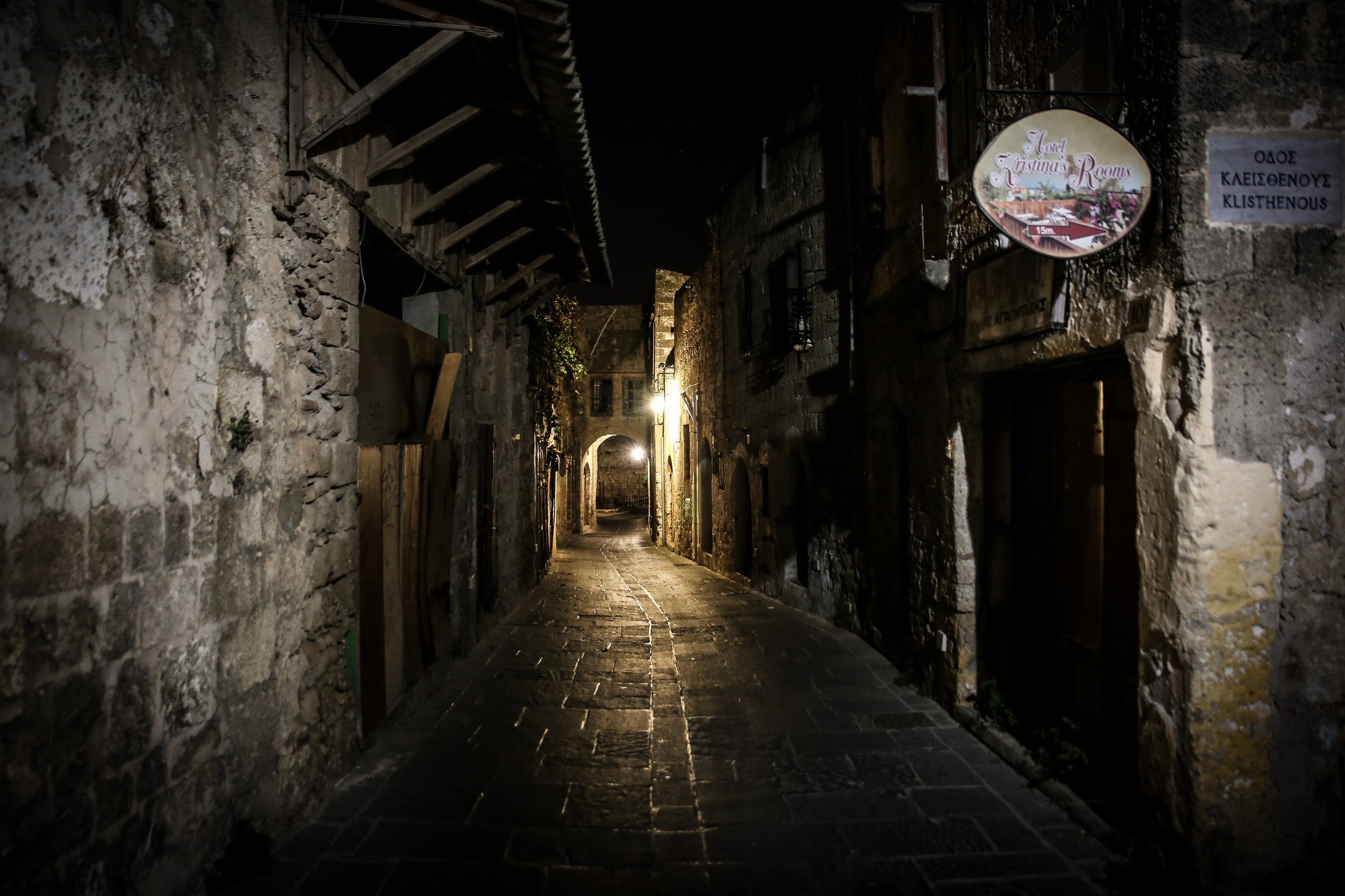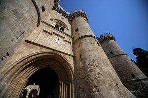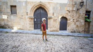 Nous voici donc fraîchement (pas si frais vu qu’il est 23h et qu’il fait toujours une bonne vingtaine de degrés dehors !) débarqués dans Rhodes. Nous cherchons un passage à travers les énormes remparts de la vieille ville pour rejoindre notre hôtel. Une fois entrés dans cette forteresse c’est un vrai labyrinthe de ruelles pavées de galets qui s’offrent à nous. Heureusement qu’on a notre super appli GPS Maps.me !