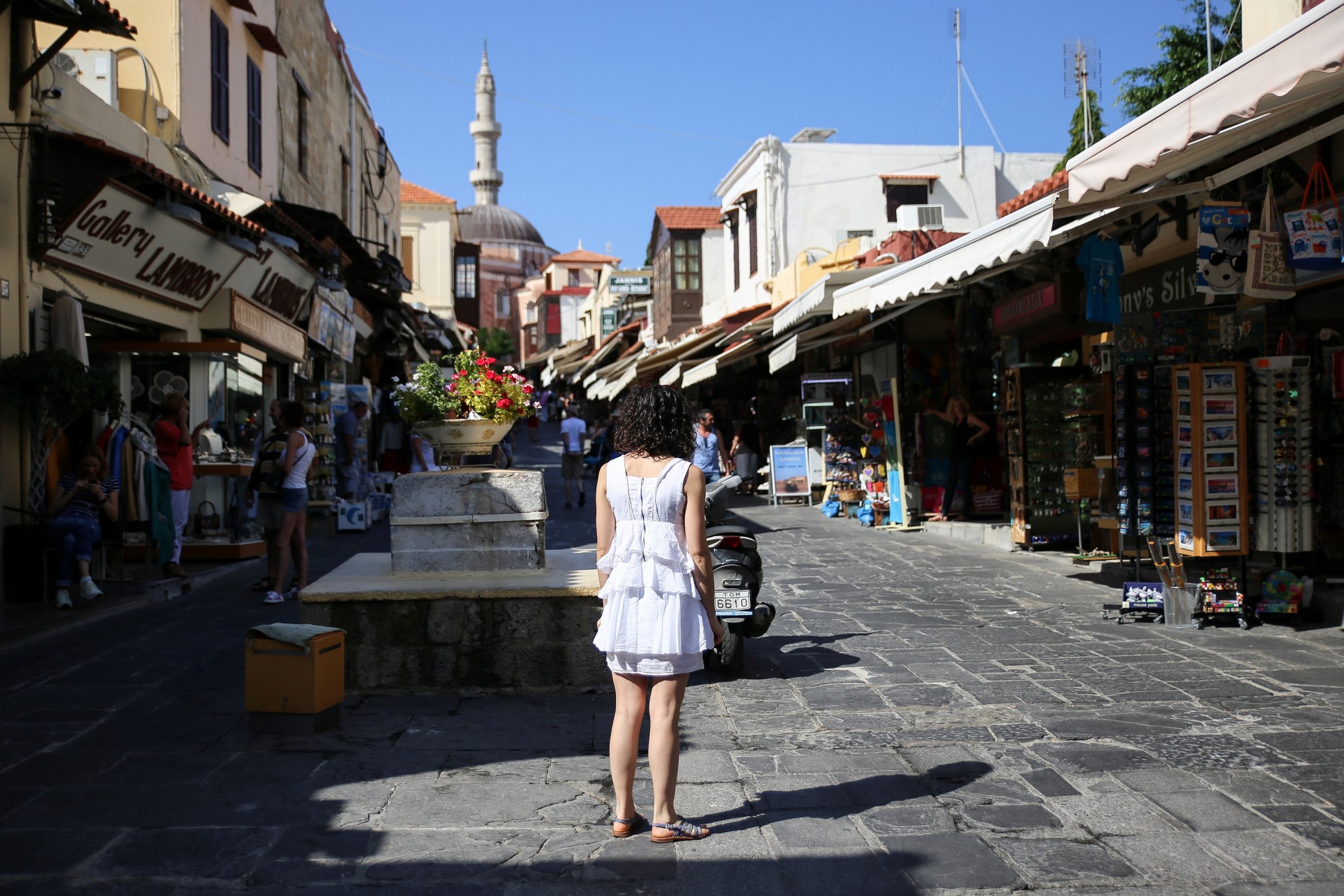 Le lendemain soleil radieux. Petit déj’ sur la terrasse, puis nous voilà partis explorer le vieux Rhodes cette fois-ci de jour. Ballade donc entre ruines grecques, quartier Juif ou mosquées turques, le tout parsemé d’innombrables boutiques de souvenirs, un chouette contraste ! La rue des Chevaliers, calme et stricte passe devant le beau Palais des Grands Maîtres puis nous mène au port de plaisance qui borde le nord de la ville, devant nous, la mer, belle et bleue. Nous prenons encore un peu de temps pour déguster une glace, écrire une carte puis nous quittons les remparts qui encerclent le centre et partons chercher notre voiture.
