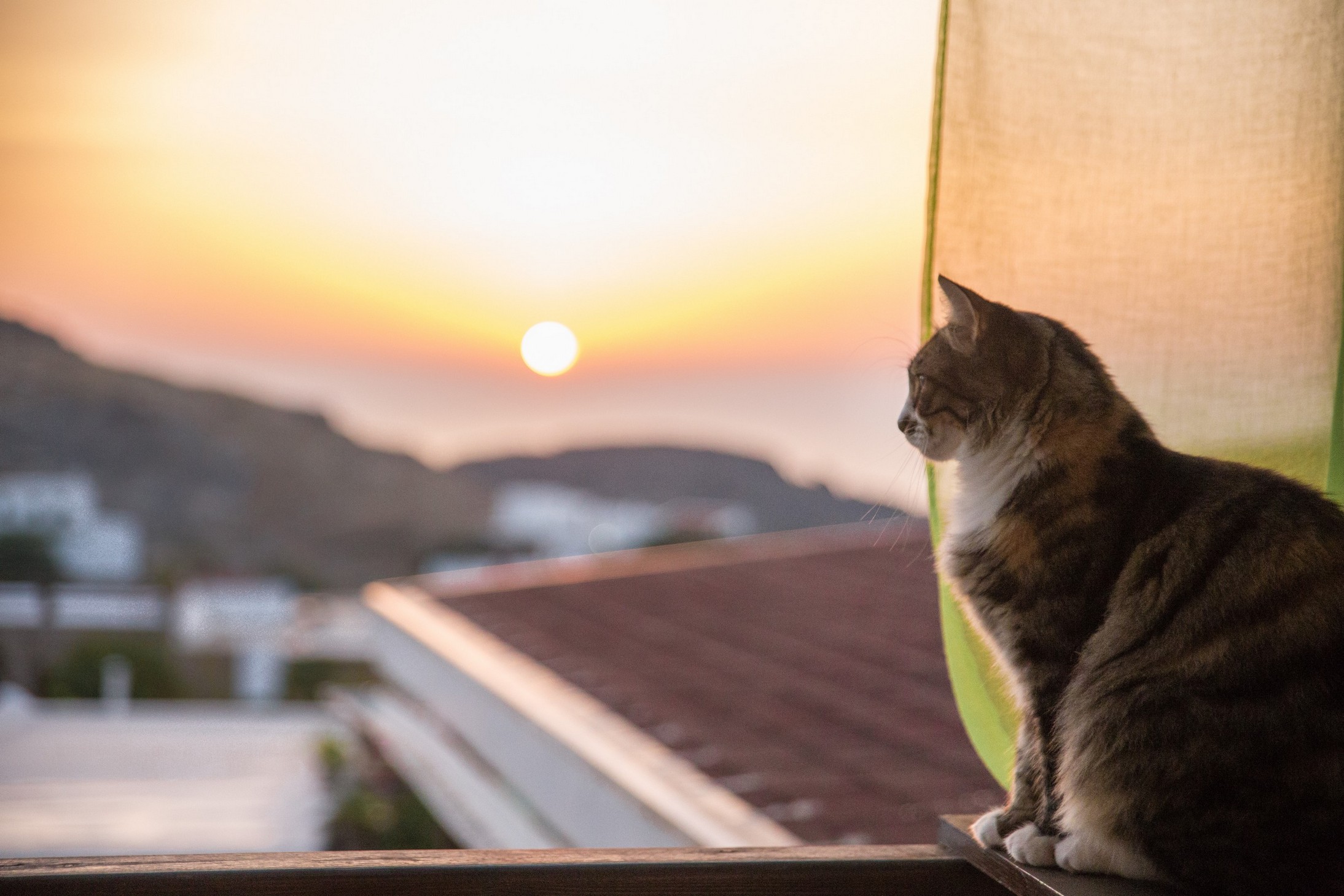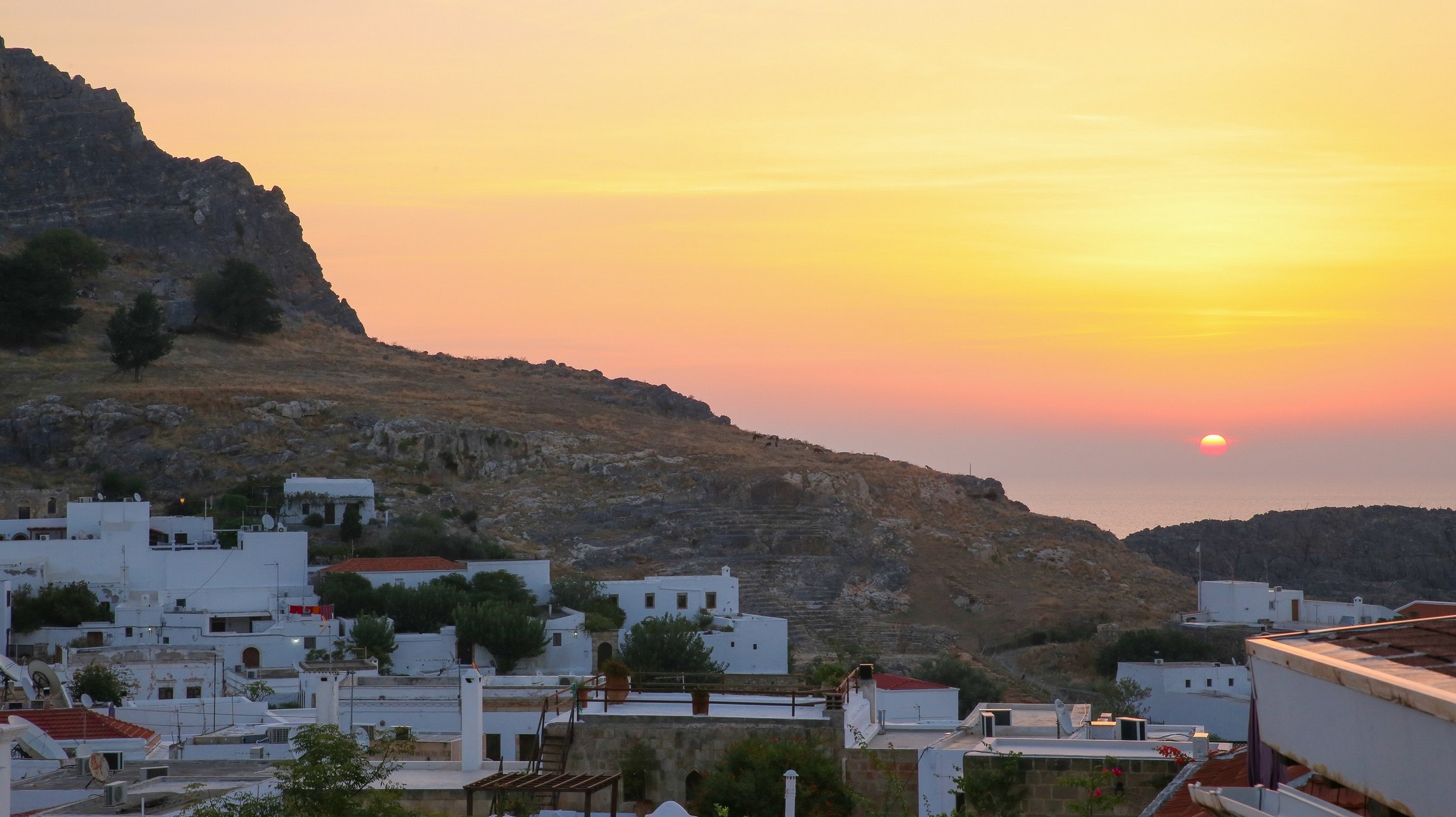 Notre chambre a une petite terrasse surplombant les toits blancs des maisons qui s’étendent jusqu’au pied de la colline, d’où nous pouvons contempler la mer, où viendra se lever demain le soleil.