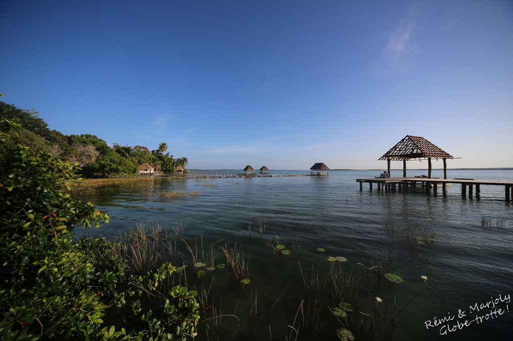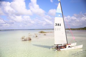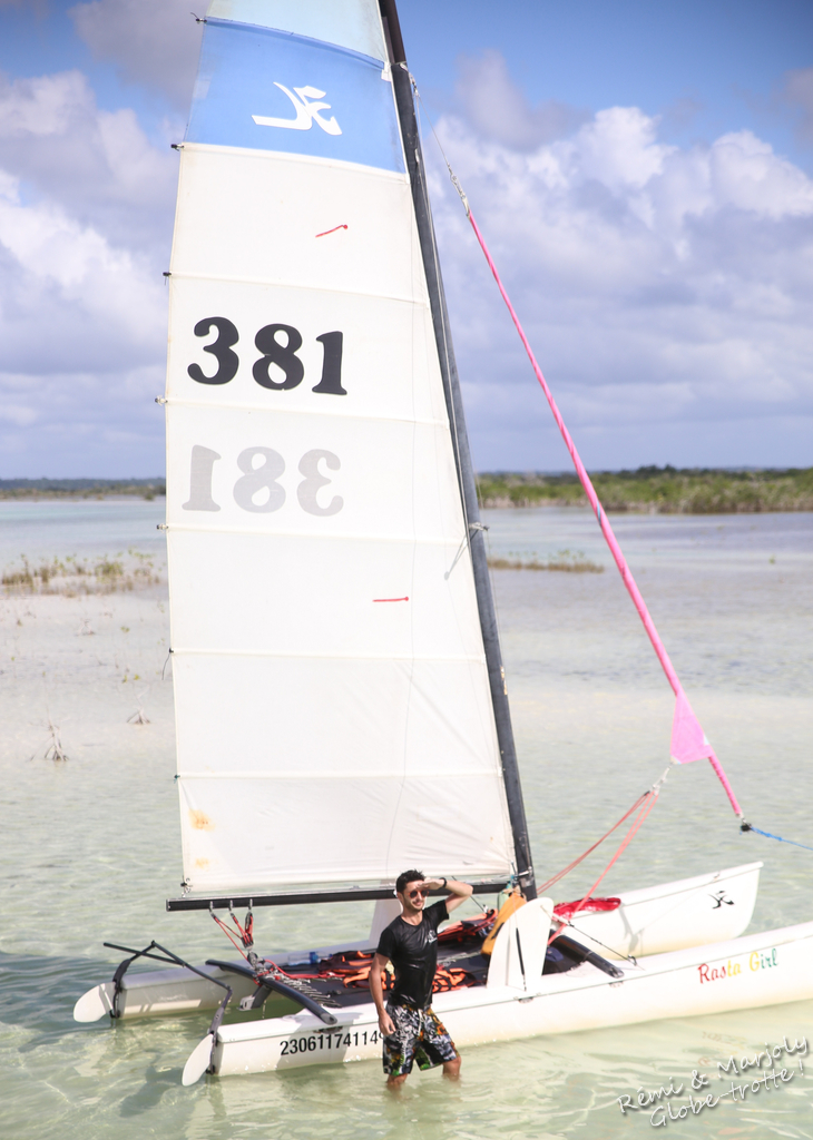 2016 commence par un grand soleil et une virée en catamaran sur la lagune. Nous sommes quatre à bord et notre skipper n’a pas beaucoup dormi mais il nous emmène au gré du vent aux quatre coins de la lagune. Le canal des pirates où l’on se tartine de boue bienfaisante, le trou bleu (cenote englouti par le lac mais que l’on devine à sa couleur), les îles aux perroquets qui ne sont pas là en décembre… On bronze, on se baigne, on se jette des arbres et c’est encore après une magnifique journée et sous un ciel rempli d’étoiles qu’on passe notre dernière nuit au Mexique, demain on passera la frontière pour le Belize !