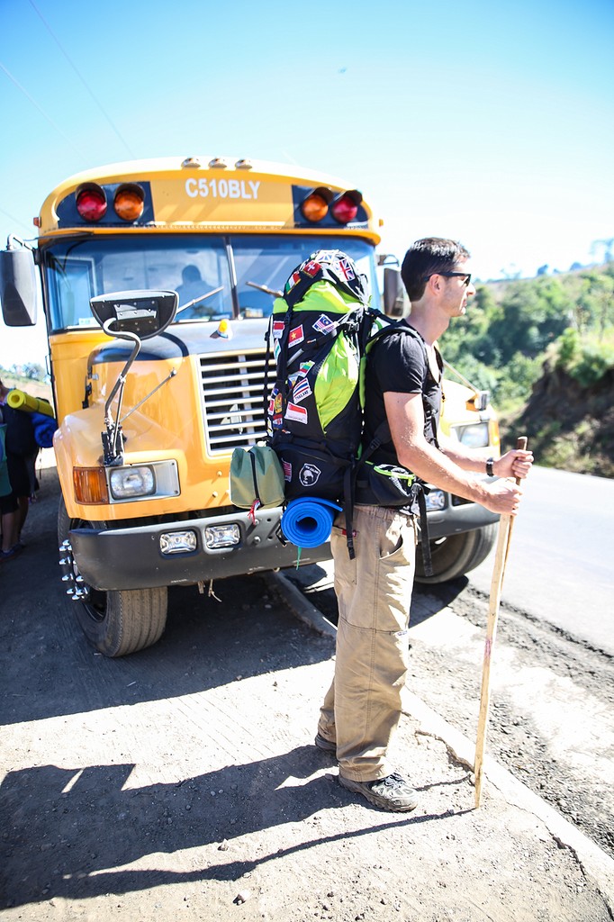 Le lendemain matin, c’est donc chargé de nos sacs bien remplis de vêtements chauds (car là-haut ça caillera) que nous quittons notre auberge. Heureusement notre cher hôte attentionné nous fera remarqué de prendre un très grand sac de rando afin de pouvoir y loger tout le matériel nécessaire au bivouac. Effectivement après 30 min de chicken-bus sur des « routes » toujours plus défoncées, on nous distribue tout l’attirail de bivouac (tente, tapis, duvet, casse-croute…) qui viendra s’ajouter à notre sac à dos… Malins, une ribambelle d’enfants guatémaltèques nous assaillent pour qu’on leur loue des battons de marche, Rémi qui est beaucoup plus chargé en prend d’emblée, moi un poil trop optimiste j’en trouverai plus loin après avoir évaluer la raideur et qualité du terrain (qui alterne entre argile boueuse et terre sableuse volcanique…que du bonheur !).