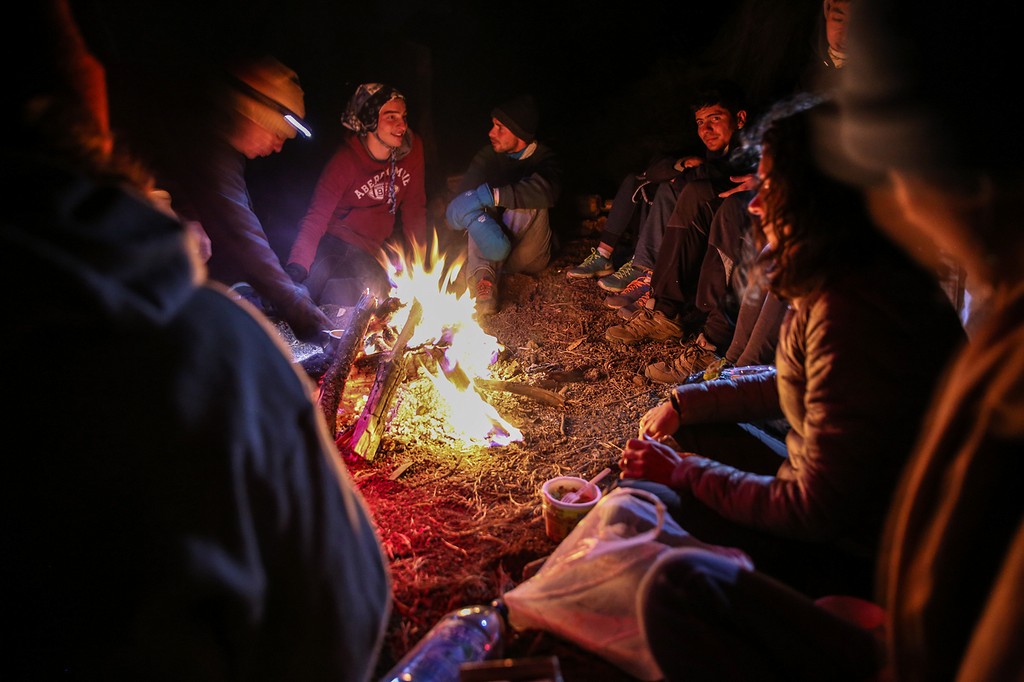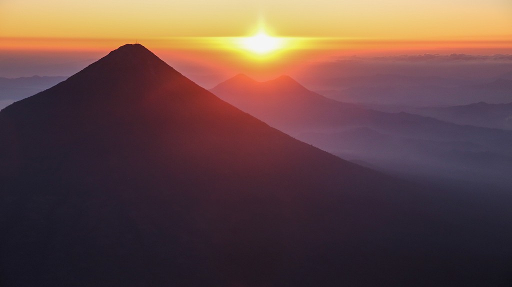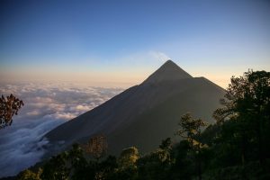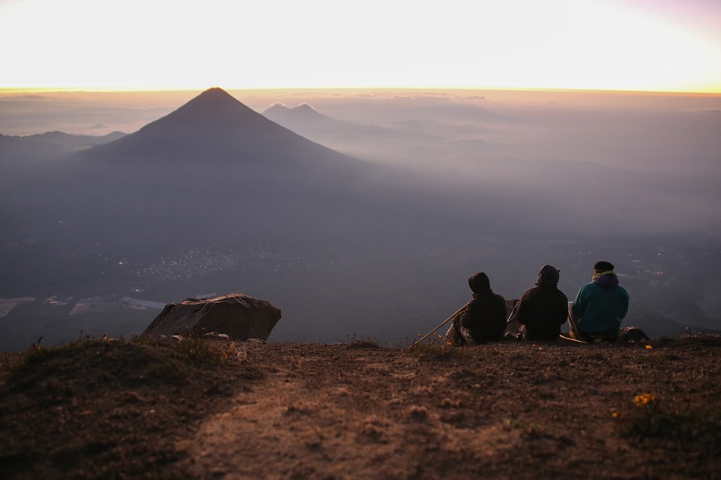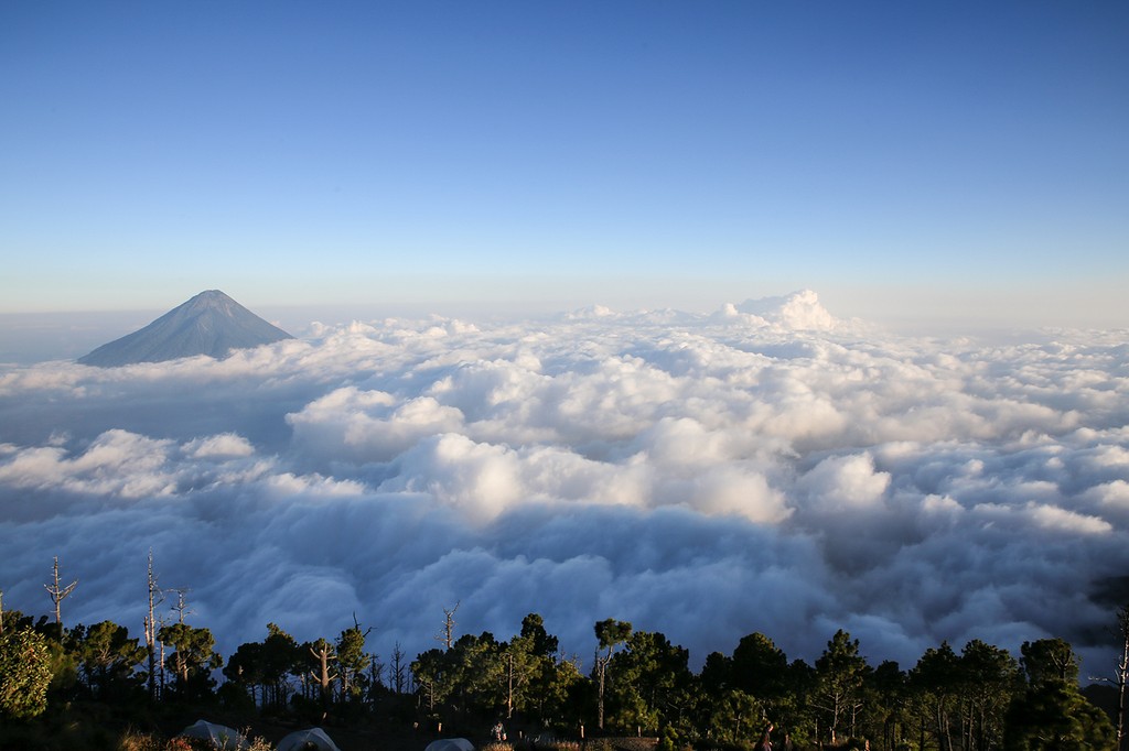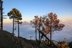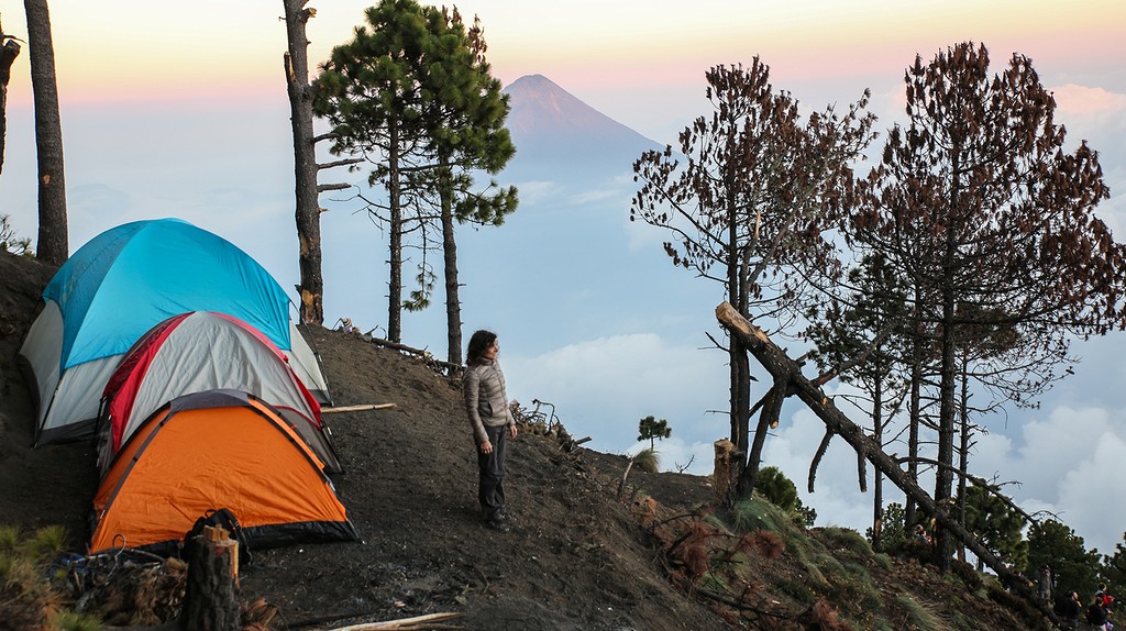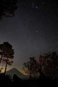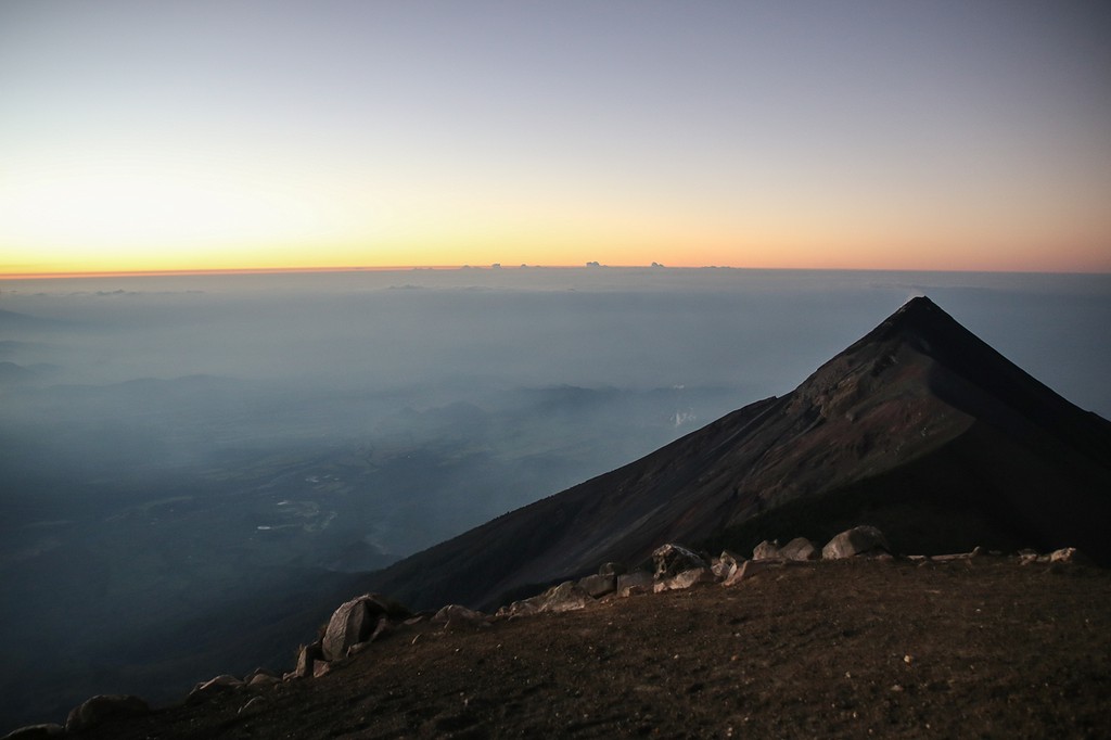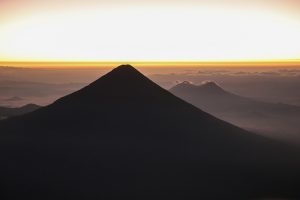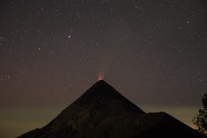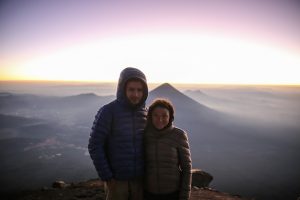 L’ascension est assez touristique, nous croisons pas mal de groupes, nous avançons avec notre guide en faisant des pauses régulièrement. Finalement, après 5 bonnes heures de grimpette, nous atteignons le campement situé à 3500m d’altitude. Effectivement avec le soleil qui commence à décliner nous avons vite froid. Ça tombe bien, il faut justement s’activer pour monter notre tente avant que la nuit tombe. Dîner sommaire au coin du feu, chamallows grillés en extra, quelques photos de la voie lactée et du volcan Pacaya qui rougit sans cracher (GRRRRR !) et hop au lit, enfin on dvrait dire au tapis, car le réveil sonne à 4h30… Inutile de préciser qu’on a peu et mal dormi, mais bon maintenant qu’on est là, il faut aller au bout. On enpile les couches de vêtements et c’est parti pour 1h de montée à la lampe frontale, puisque le but c’est de voir le soleil se lever (et donc qu’il fait encore nuit noir). C’est à l’aube que nous atteignons le sommet, déstabilisés par des bourrasques de vents violentes et engourdis par le froid. On profite du magnifique panorama qui s’offre à nos yeux : vue splendide sur le Pacaya et l’Agua avec en tout petit Antigua à leur pieds. Quelques photos et on ne s’attardera pas trop, nous devons encore replier le campement et Rémi n’est pas au mieux de sa forme.