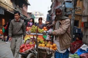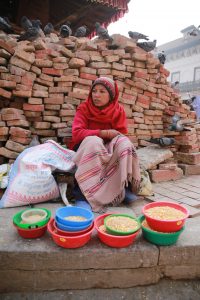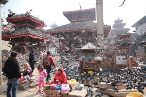 Le climat est encore frais le soir, les touristes ne sont encore pas trop là. Les poteaux électriques sont encore plus surchargés, les grandes enseignes sont restées, de plus petites ont changé mais globalement le quartier est resté le même, les vendeurs de violons sont au même Carrefour et il fait toujours bon manger des momos à Momo Star dans la petite ruelle. L’électricité est toujours un calvaire, éparse dans la journee. Ici un immeuble est tombé, il y avait un restaurant avec terrasse, j’y étais resté plusieurs heures, j’espère que personne n’est mort. Ici aussi il y a un trou a l’emplacement d’une maison, là encore un autre… Sinon des fissures, menaçantes dangereuses ou non. Un peu partout, des poteaux en bois maintiennent des murs branlants, Durban Square, le centre historique des temples est ravagé. Les gardiens guettent toujours le touriste pour vendre les tickets mais les temples sont devenus des tas de briques, une photo rappelle à quoi il était censé ressembler… Ici les gens ont souffert et chaque secousse comme il y en a encore souvent rappelle la précarité des logements. La capitale s’en remet doucement, pas grâce au gouvernement. La vie est toujours là, grouillante, tout le monde travaille, vends, porte, les couleurs et les odeurs sont restées.