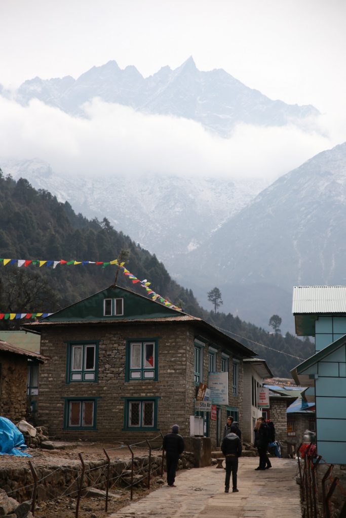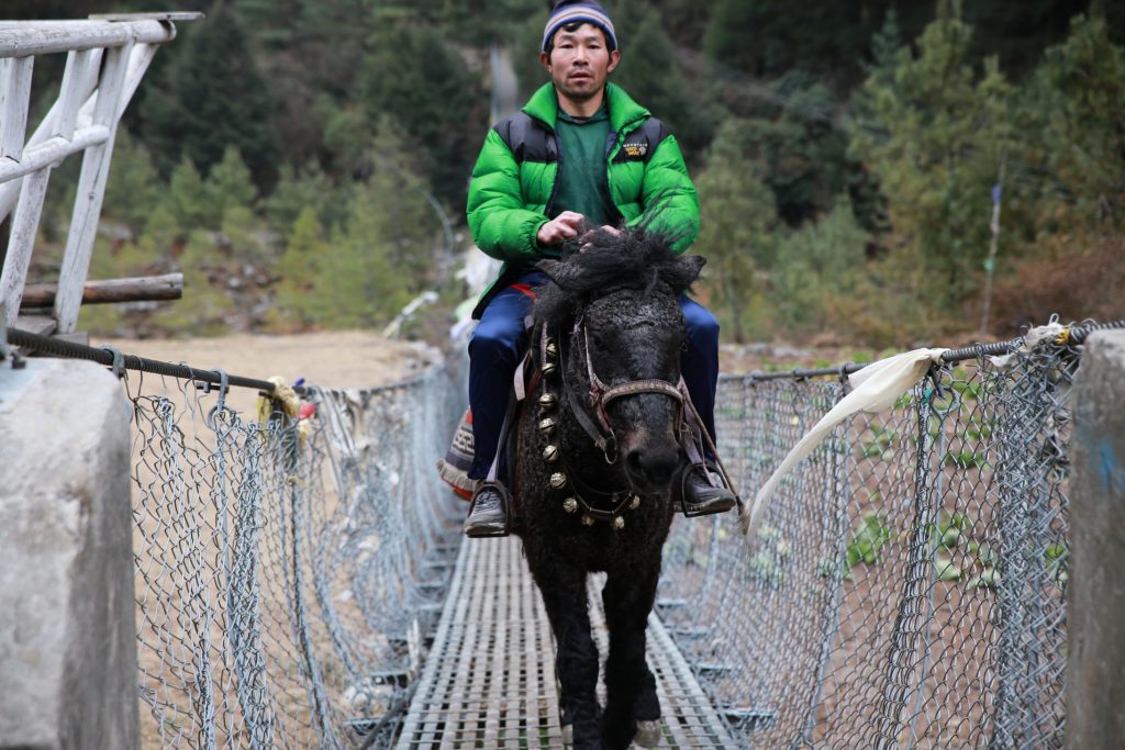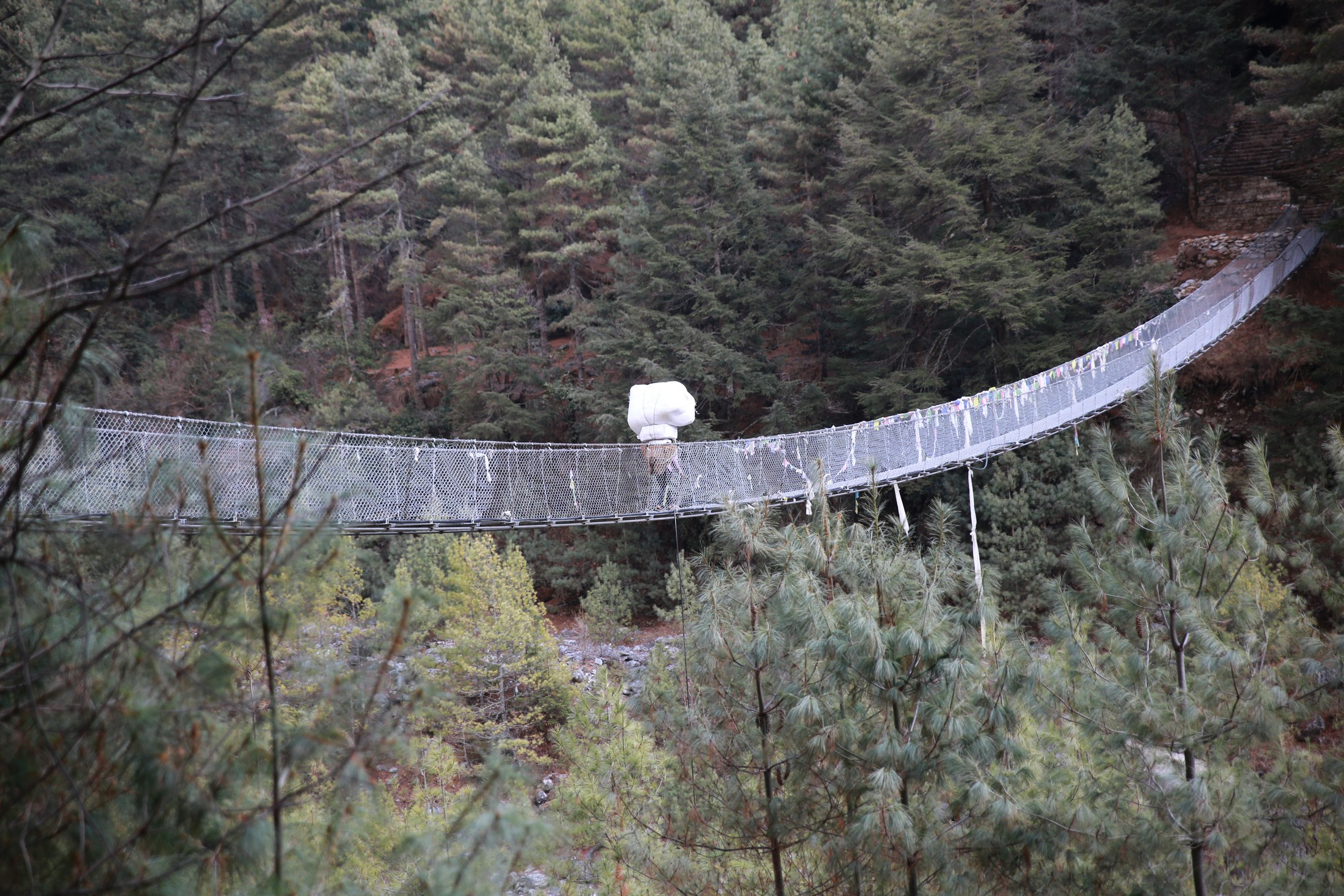 Lukla c’est un grand village, le hub d’arrivée, déjà les prix se sont envolés par rapport à Katmandou, ici tout vient à dos d’homme, de mule, mais rarement en avion. Après un dejeuner copieux il est temps de se mettre en route. Je suis bien chargé, trop peut-être, environ 18kg, mais l’expérience m’a appris que je ne serai que trop content de manger de la tomme, du saucisson, d’avoir quelques snikers d’avance et de pour finir mes déjeuner avec une bonne tartine de nutella dans les moments difficiles !