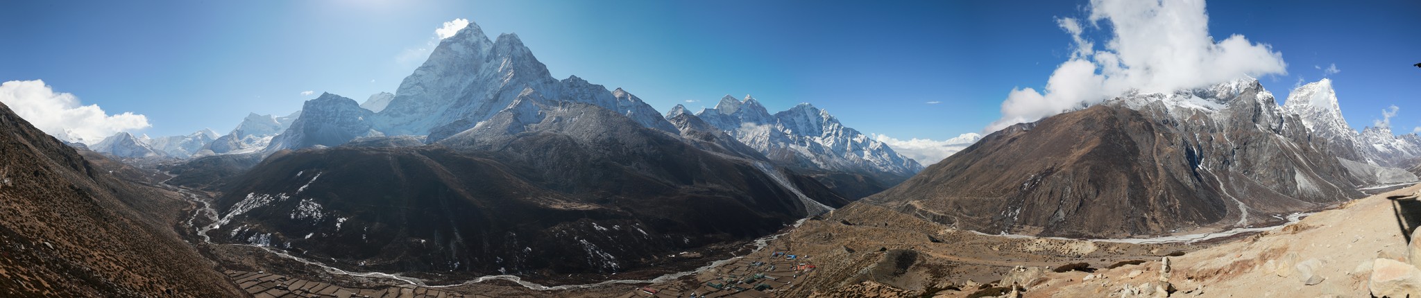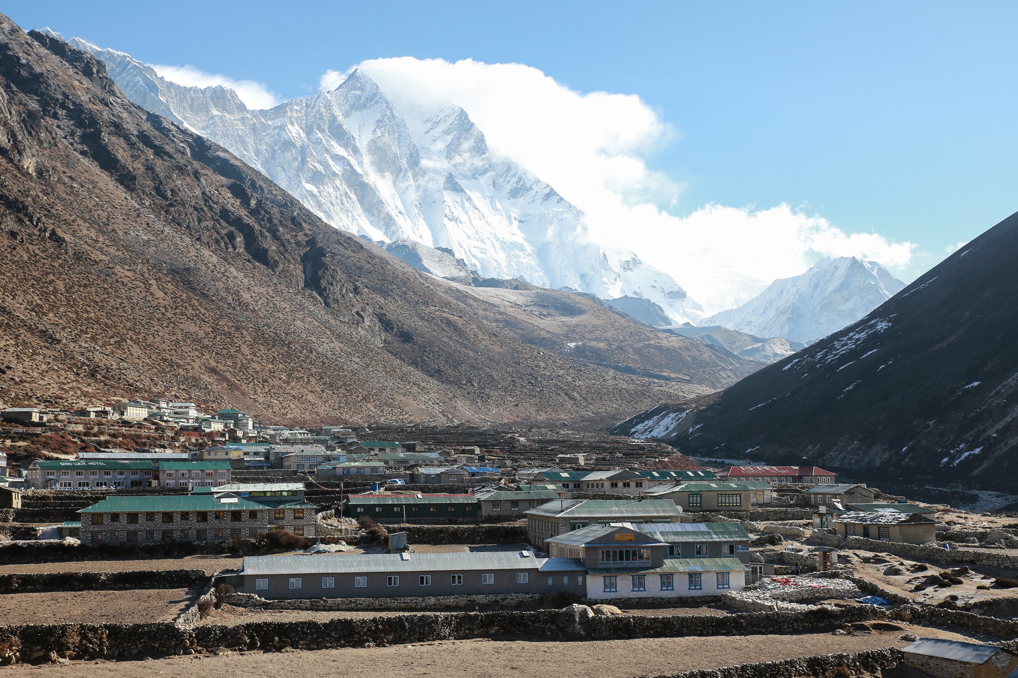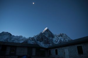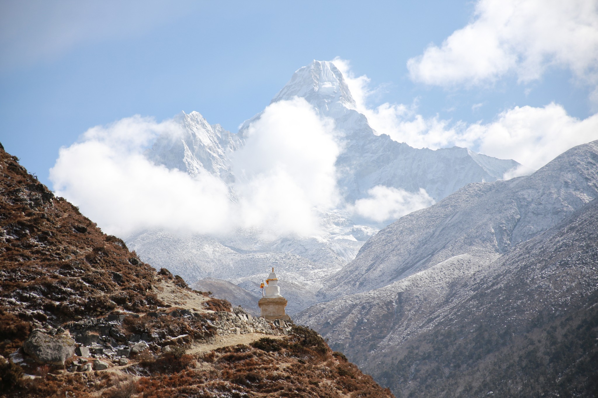 La nuit a été encore plus fraîche, le temps paraît un peu couvert. Un peu decu je passe rapidement l’épreuve qui consiste à poser son pijama (collant et manches langues termique àvec polaire, le tout dans le sac de couchage sous deux couvertures) et à renfiler les affaires de marche. Je rejoins les autres dans la salle principale pour le pti dej (souvent pancake au miel avec un grand café) et peu de temps après le soleil se lève et traverse les nuages, la tempête a laissé 4-5cm de neige et àvec le soleil les couleurs sont magnifiques ! On part donc dans la neige fraîche pour la ballade de la journee, rejoindre Dingboche à 4100m, environ 6h de marche au programme. Le sentier est encore plus beau que la veille, on avance de quelques kilomètres puis on traverse la rivière et soudain tout le monde se fige, on est tout près de l’Ama Dablam, il se dresse juste devant nous, magique. On avance dans sa direction pendnant presque toute la marche. Le temps est beau et chaud, on marche en t-shirt pendant un moment, superbe lunch de saucisson fromage devant la belle montagne avant de finalement arriver à Dingboche qui est vraiment au pied de l’Ama Dablam, hélas maintenant dans les nuages il faudra attendre le lendemain pour le revoir.